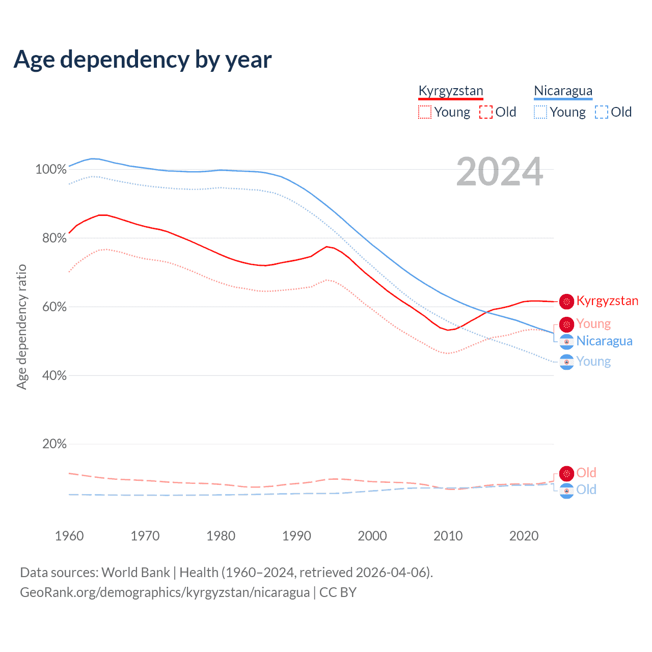 - The share of old-age demographic (65+) in Kyrgyzstan is 5.68% vs 5.53% in Nicaragua.