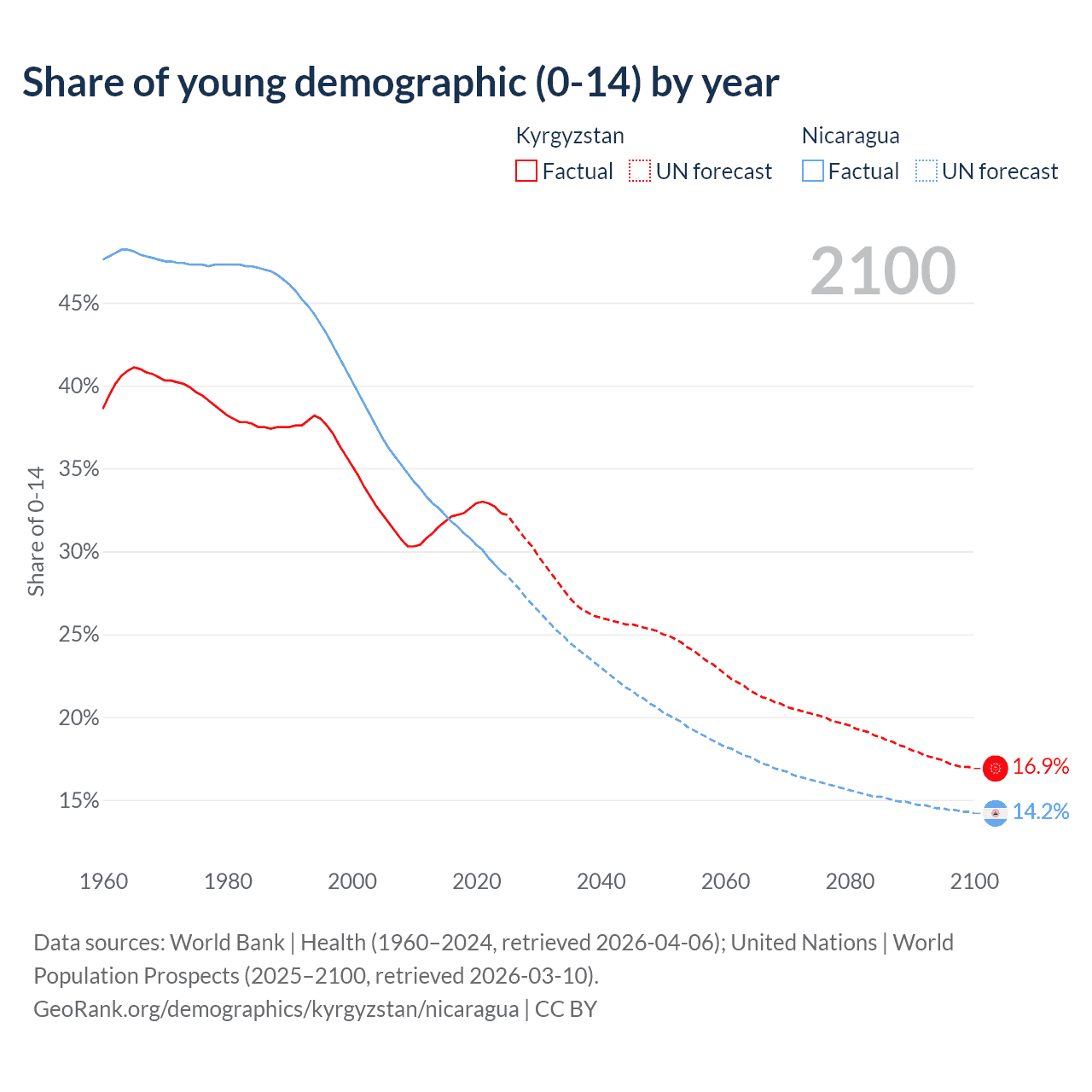 - The share of young demographic (0-15 years old) in Kyrgyzstan is 32.3% vs 28.8% in Nicaragua.