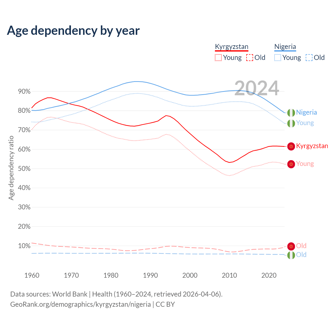 - The share of old-age demographic (65+) in Kyrgyzstan is 5.68% vs 3.05% in Nigeria.