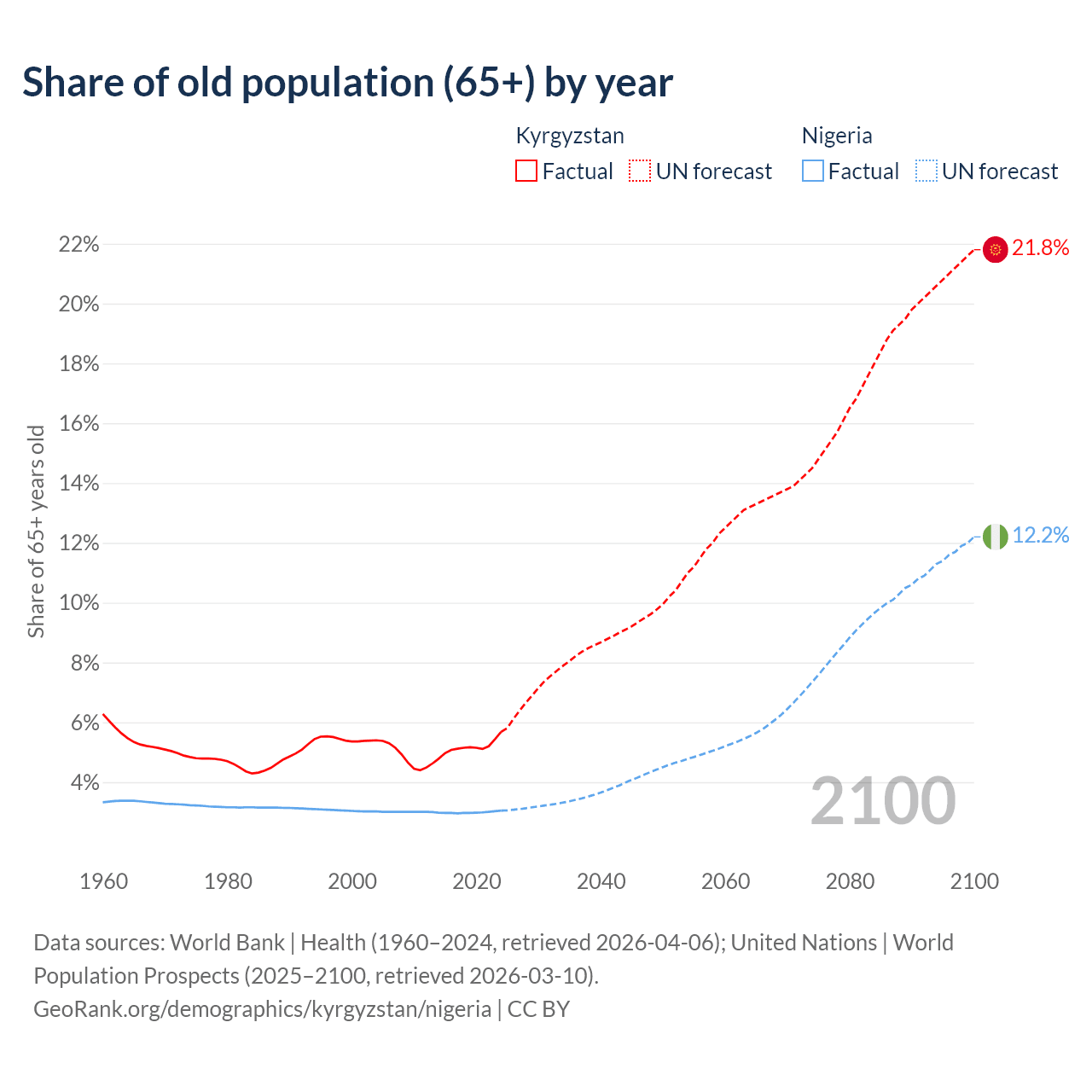 The share of older people aged 65 and over is 5.68% in Kyrgyzstan and 3.05% in Nigeria. Life expectancy in Kyrgyzstan compared to Nigeria .