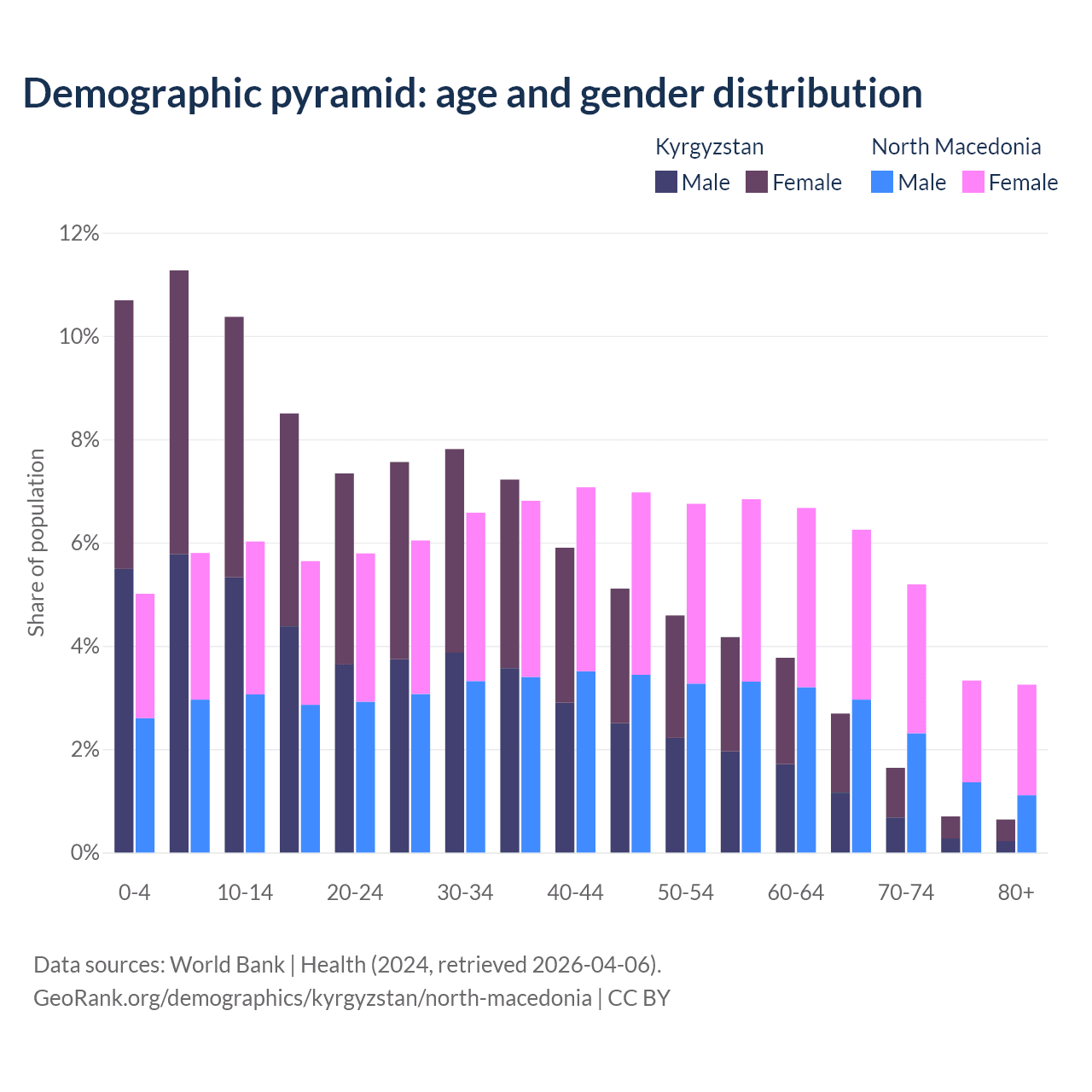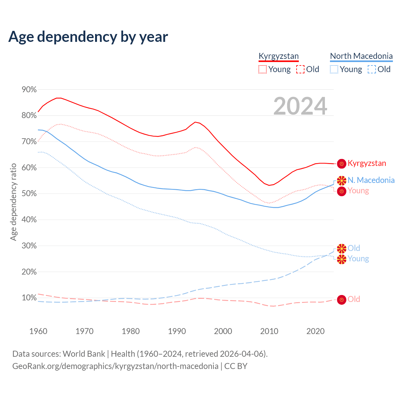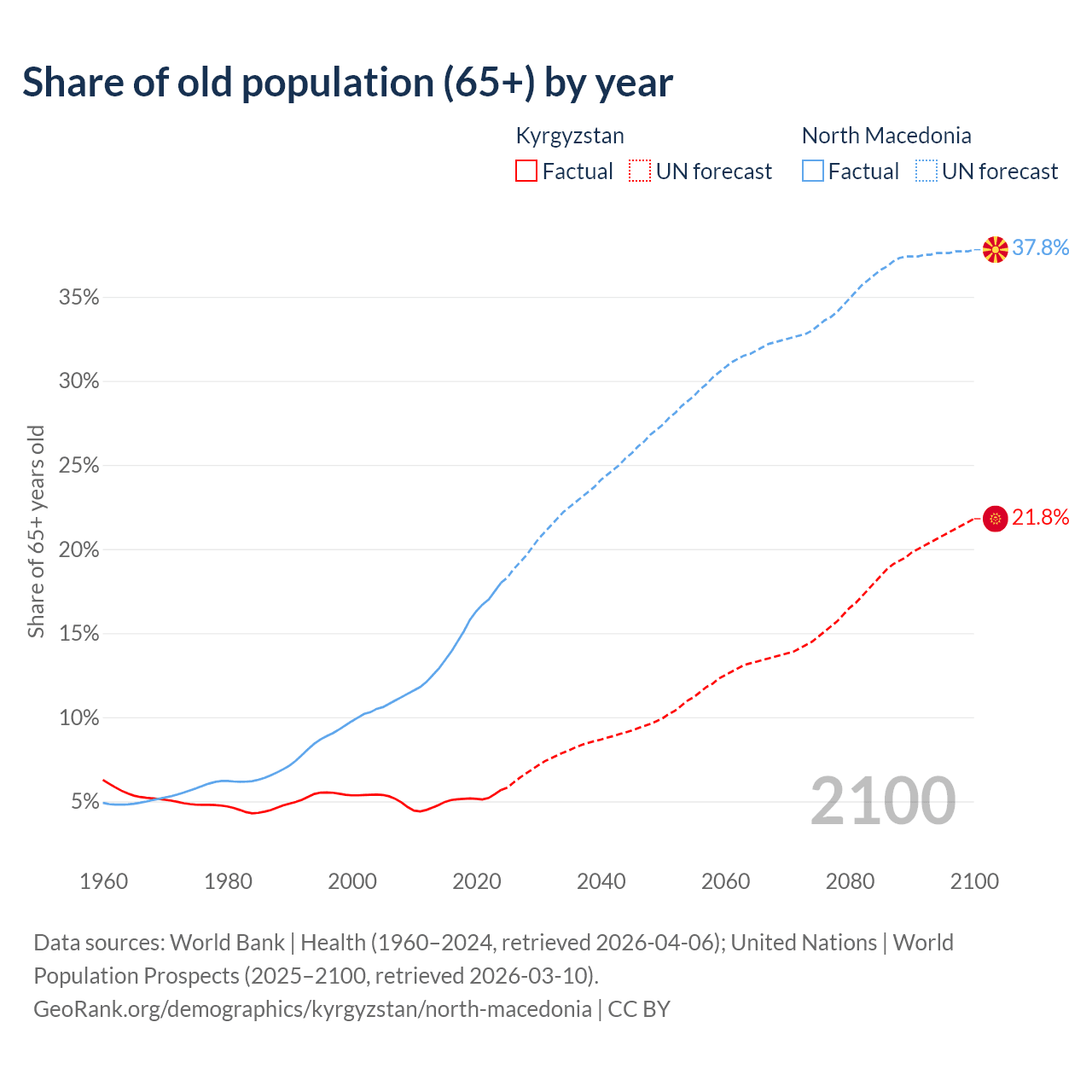 The share of older people aged 65 and over is 5.68% in Kyrgyzstan and 18% in North Macedonia. Life expectancy in Kyrgyzstan compared to North Macedonia .