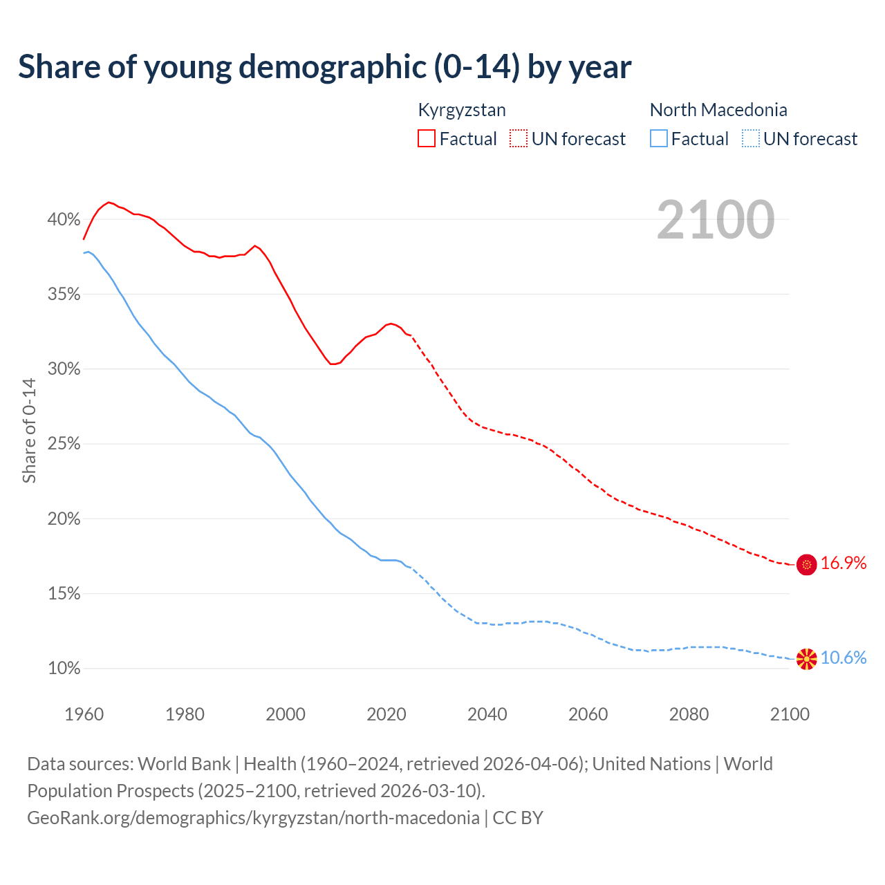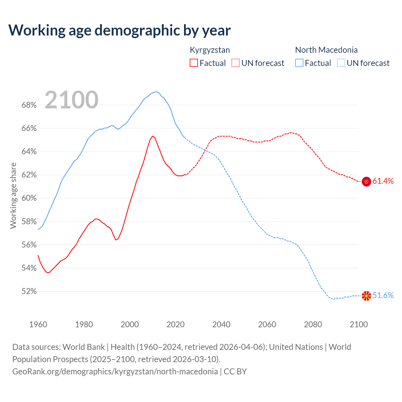 Median age Kyrgyzstan vs North Macedonia, 1960-2100
