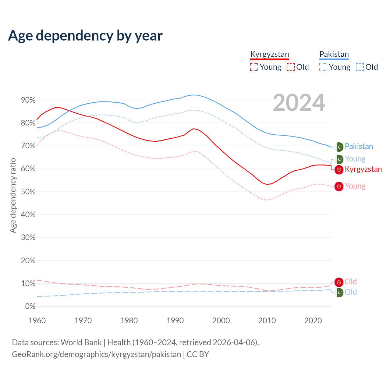 - The share of old-age demographic (65+) in Kyrgyzstan is 5.68% vs 4.28% in Pakistan.