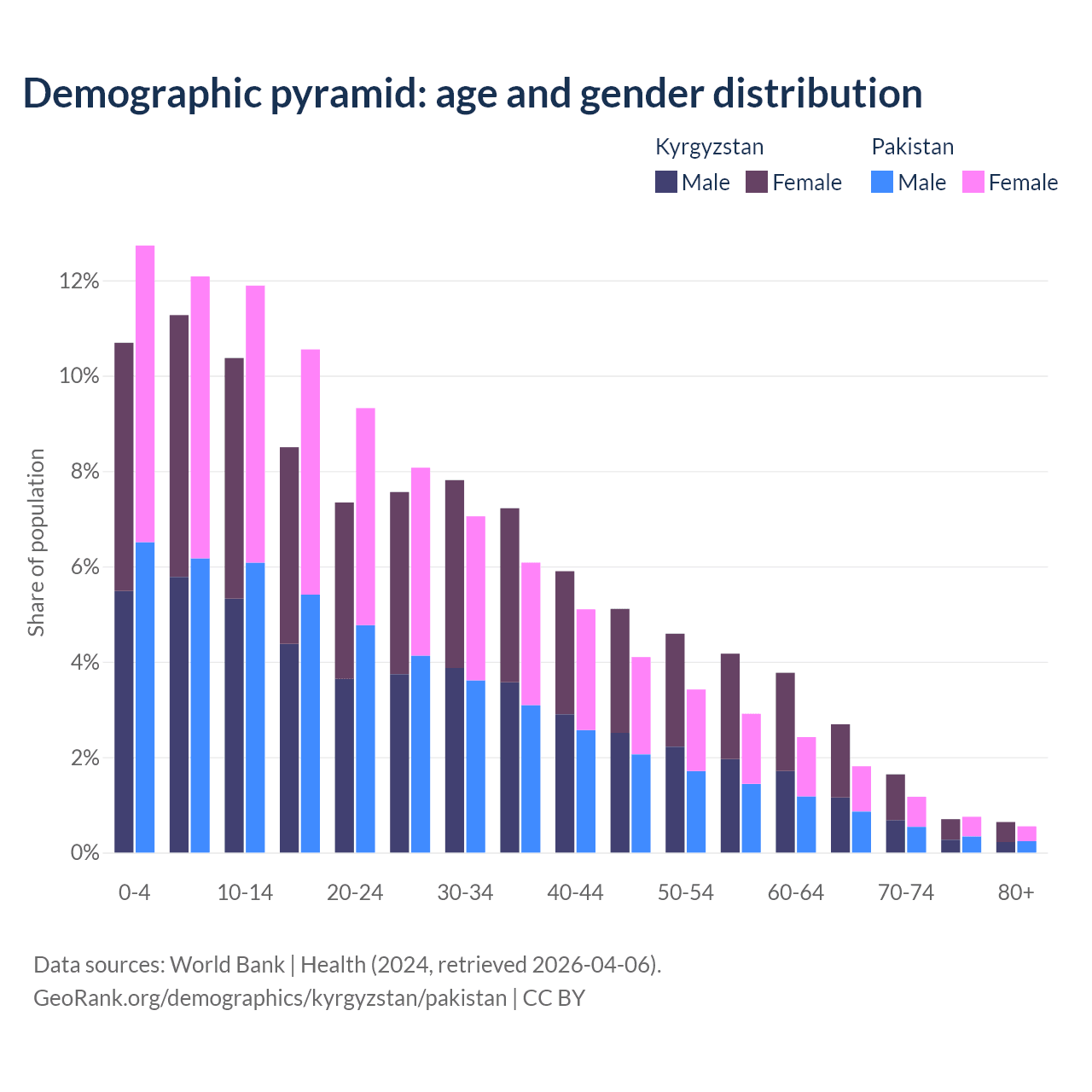 - As of 2026, the population of Kyrgyzstan is 7.47M vs 260M in Pakistan - 34.8 times difference.