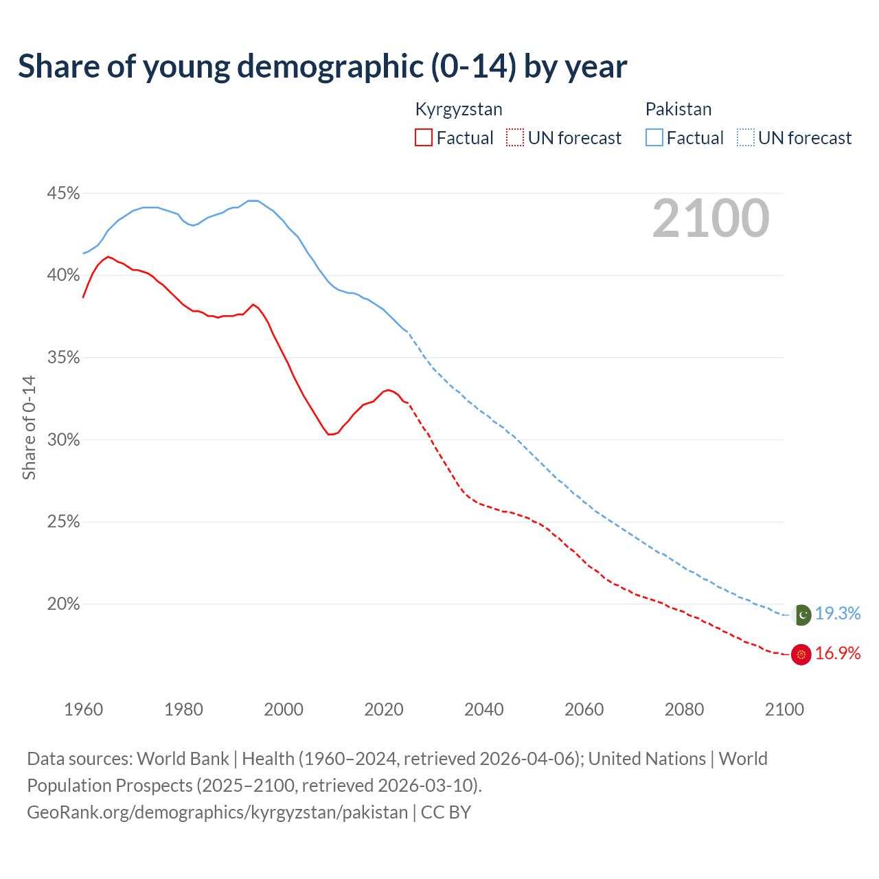 - The share of young demographic (0-15 years old) in Kyrgyzstan is 32.3% vs 36.7% in Pakistan.