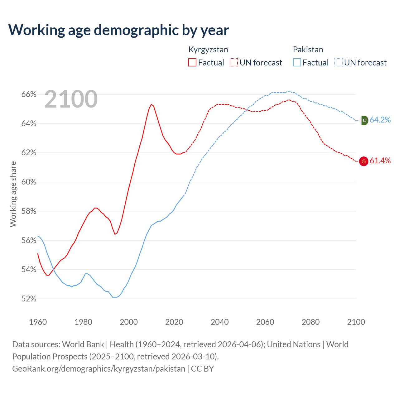 - Kyrgyzstan has 4.63M working age adults (aged 15-64) vs 154M in Pakistan.
