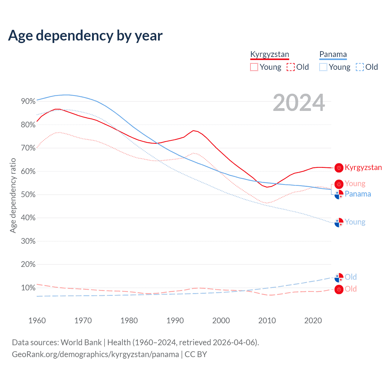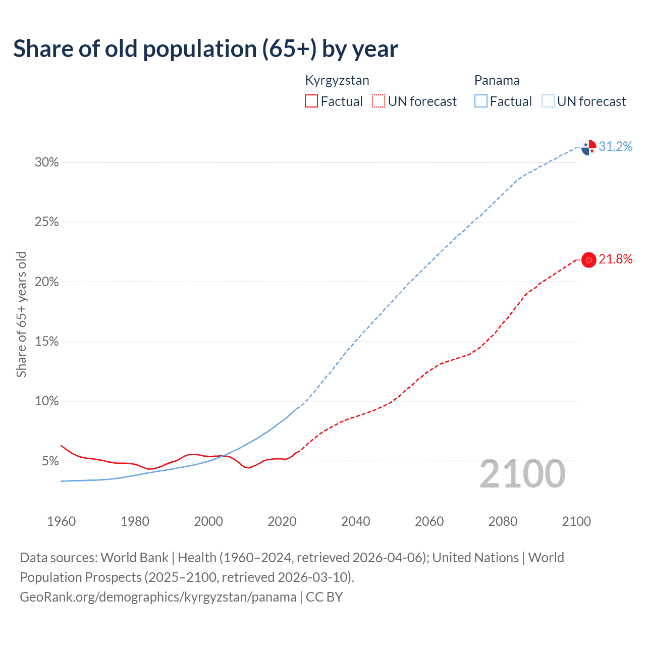 - The share of old-age demographic (65+) in Kyrgyzstan is 5.68% vs 9.35% in Panama.