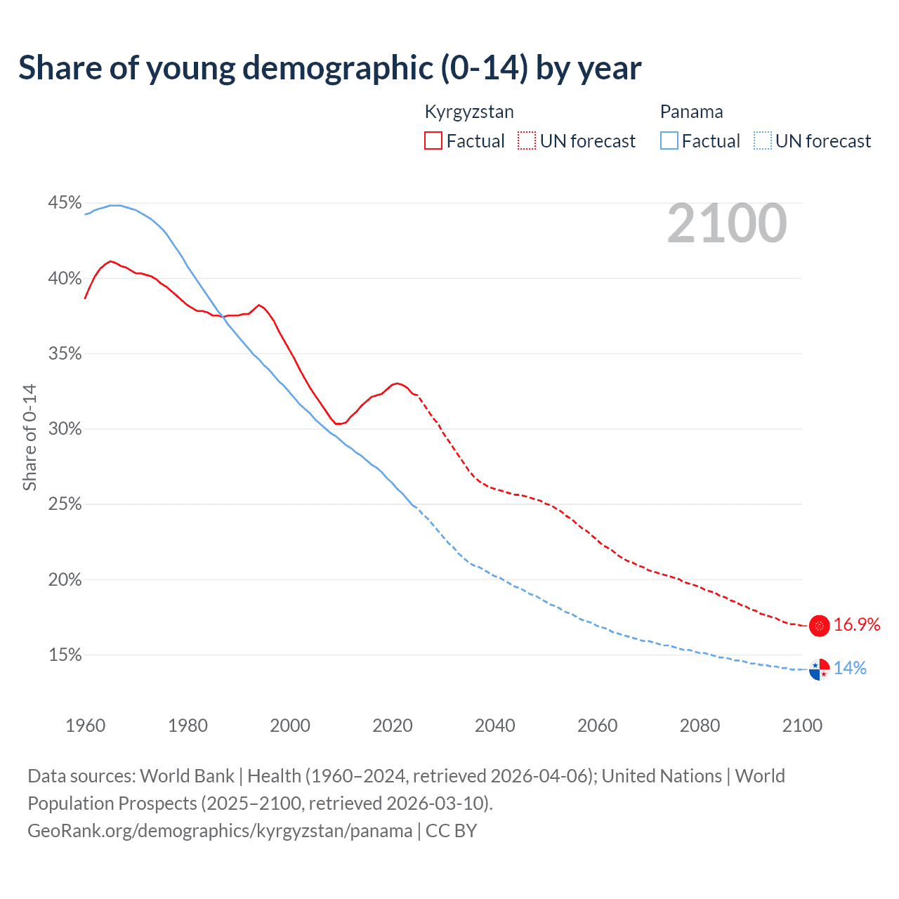 - The share of young demographic (0-15 years old) in Kyrgyzstan is 32.3% vs 24.9% in Panama.