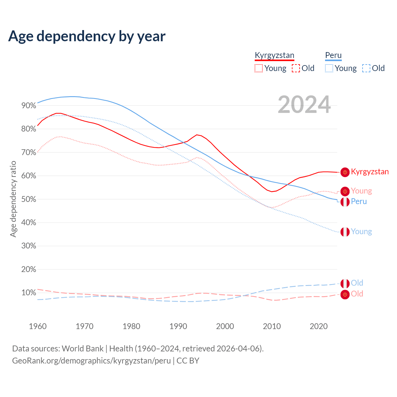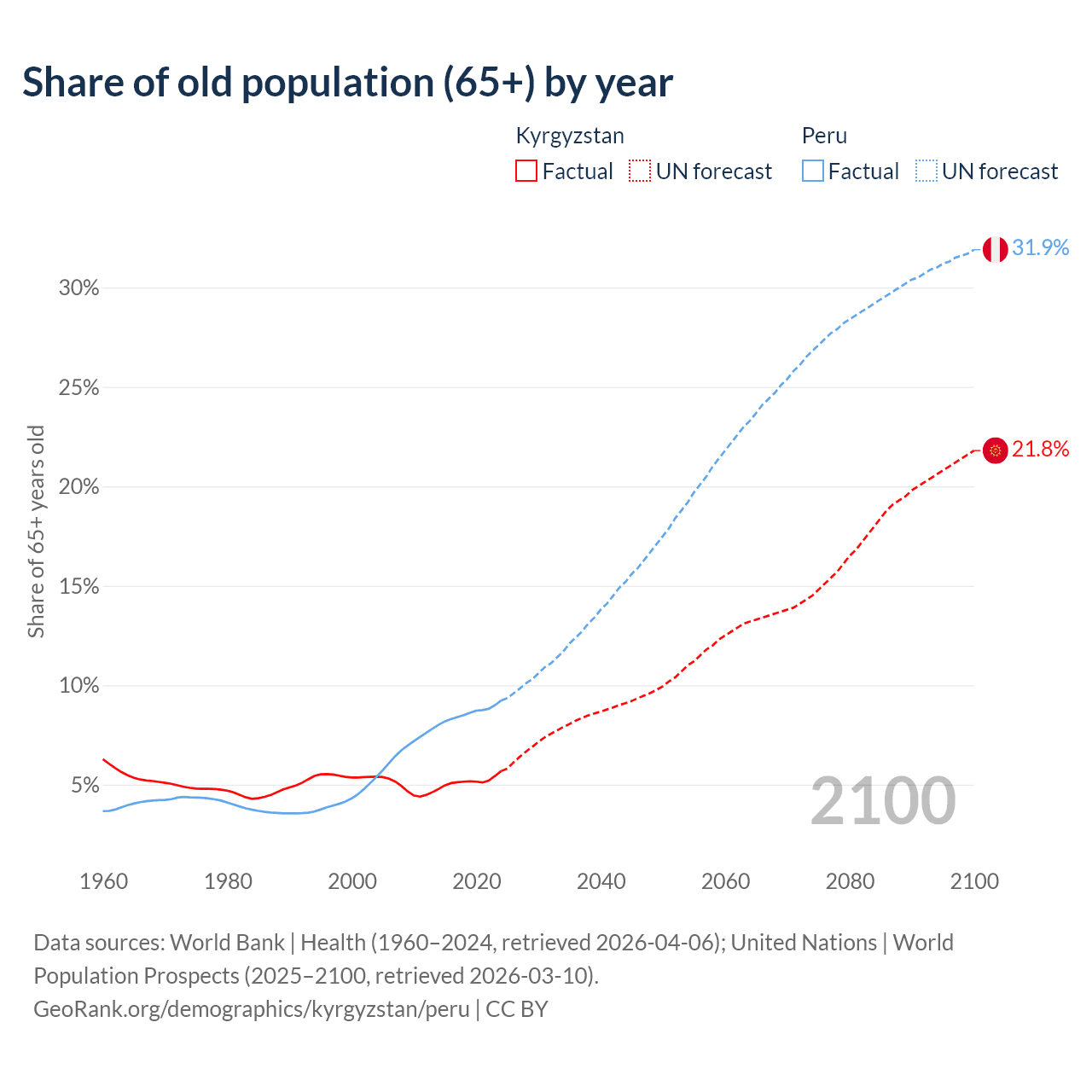 - The share of old-age demographic (65+) in Kyrgyzstan is 5.68% vs 9.23% in Peru.