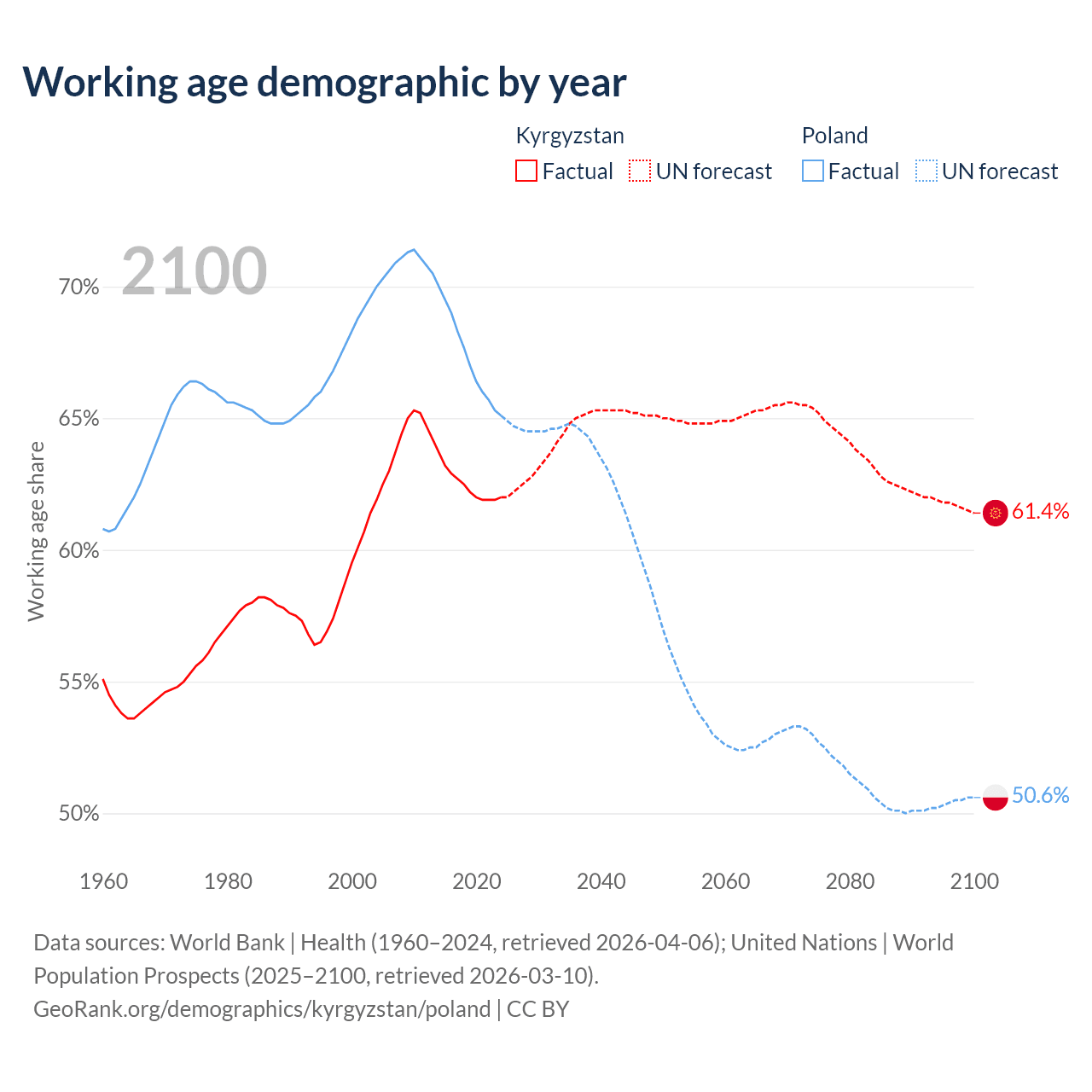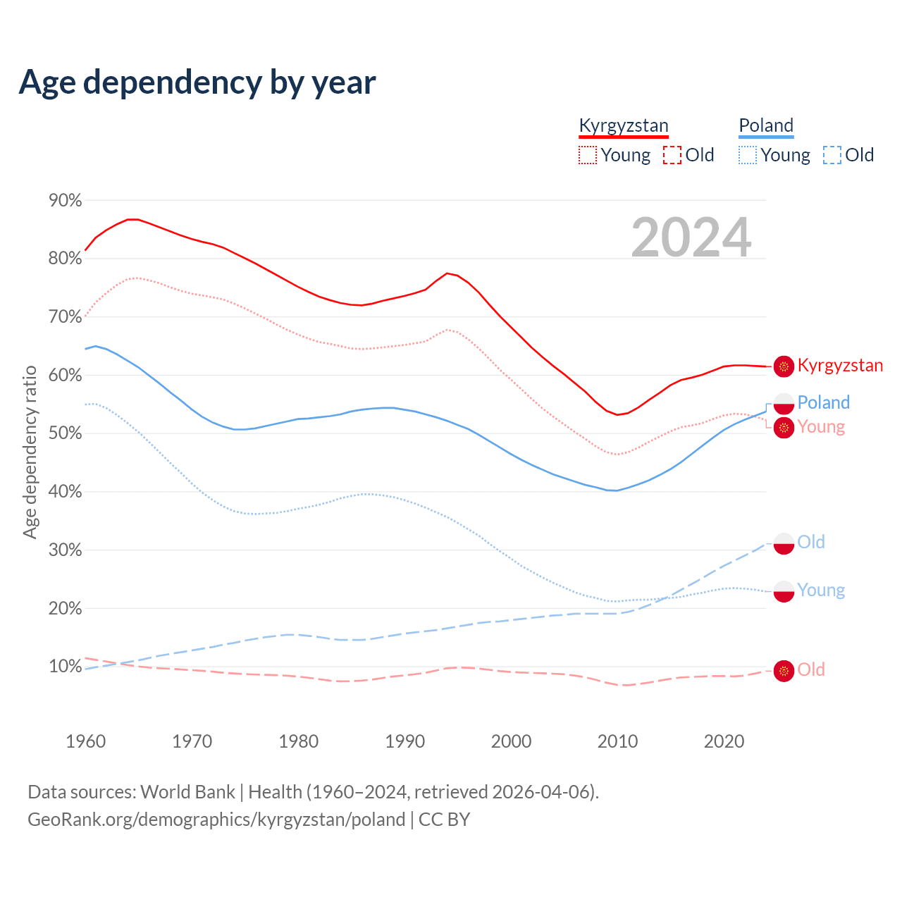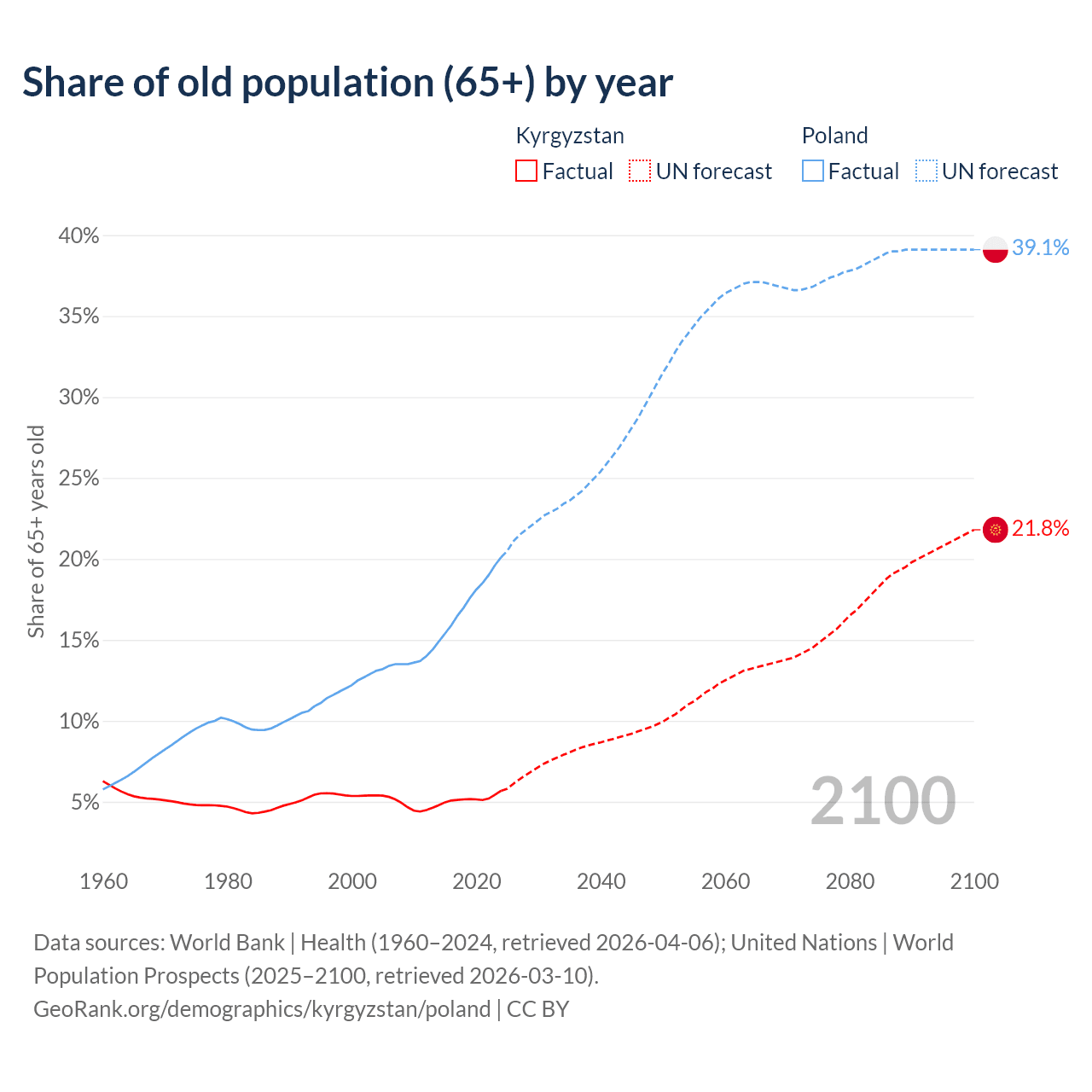- The share of old-age demographic (65+) in Kyrgyzstan is 5.68% vs 20.1% in Poland.