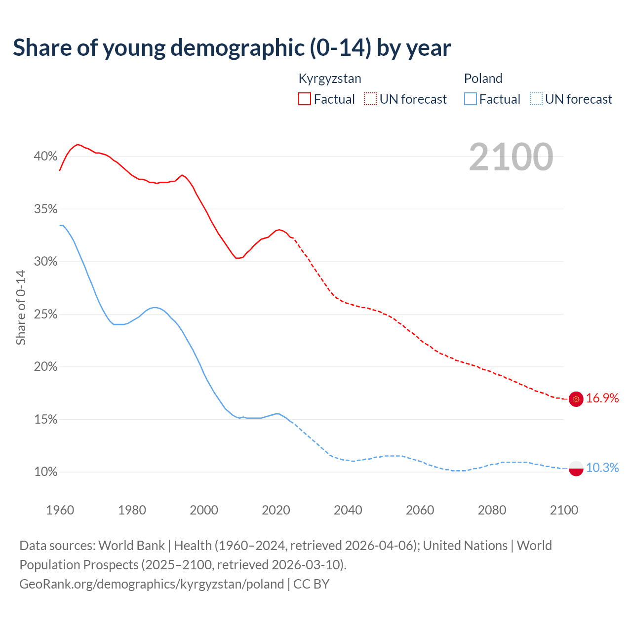 - The share of young demographic (0-15 years old) in Kyrgyzstan is 32.3% vs 14.8% in Poland.