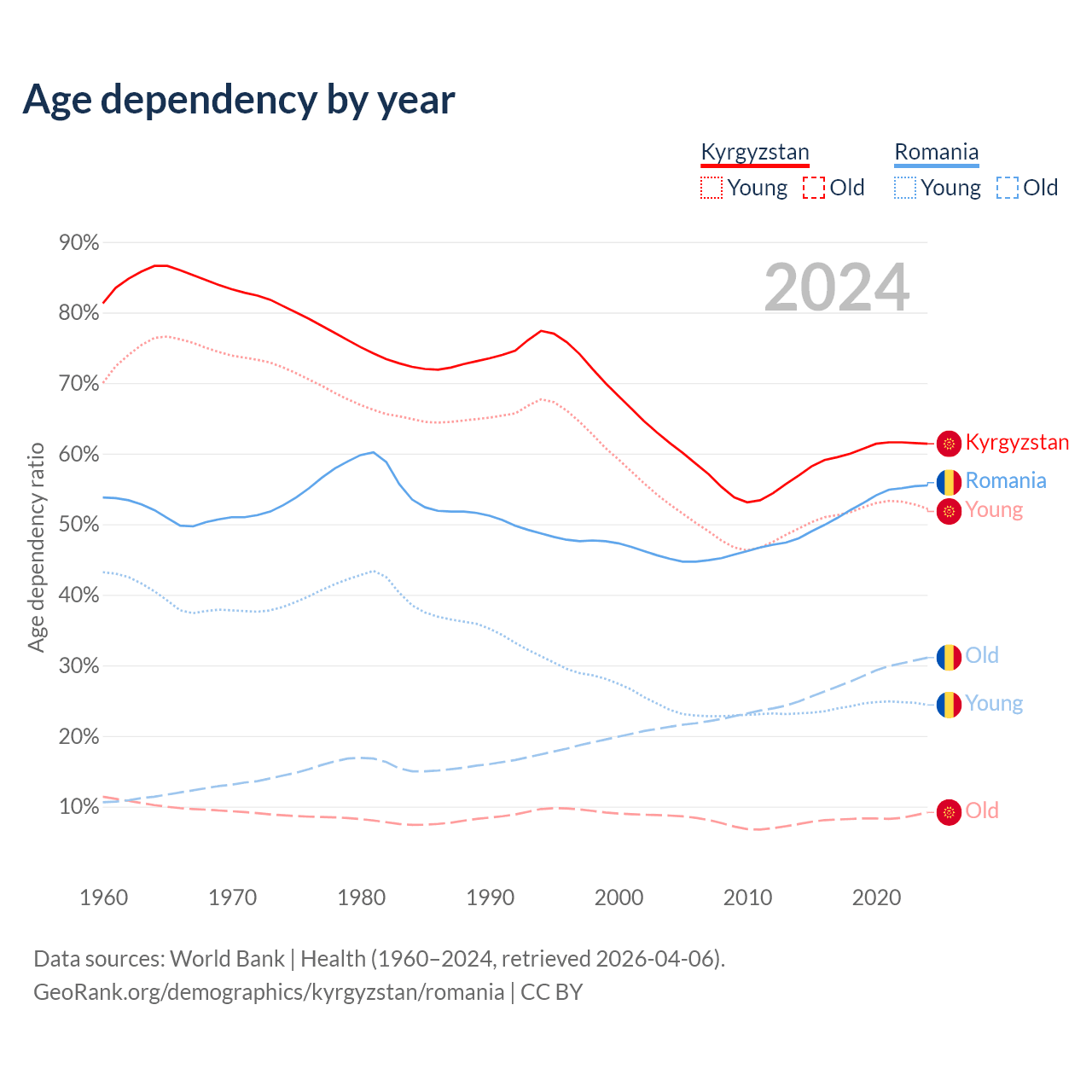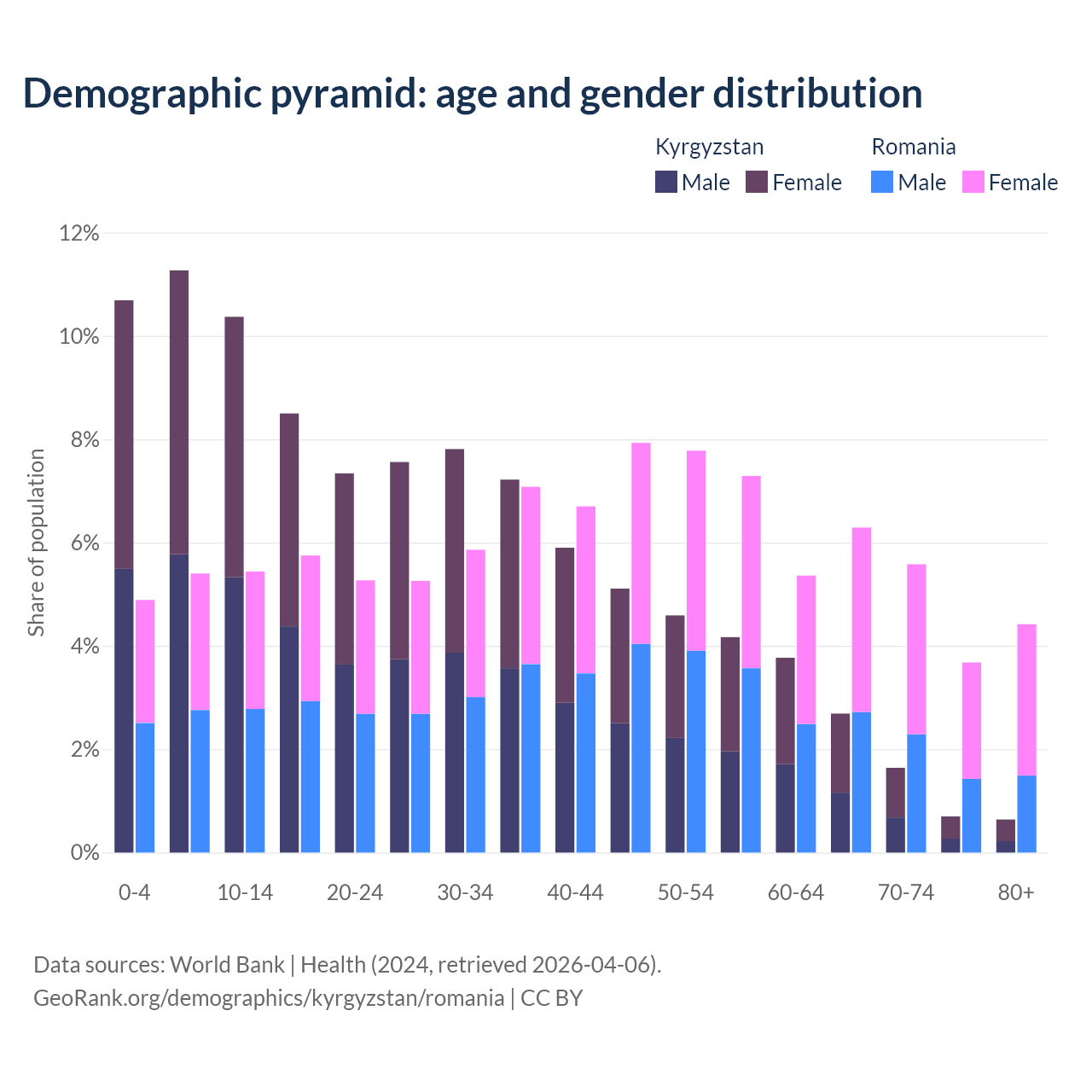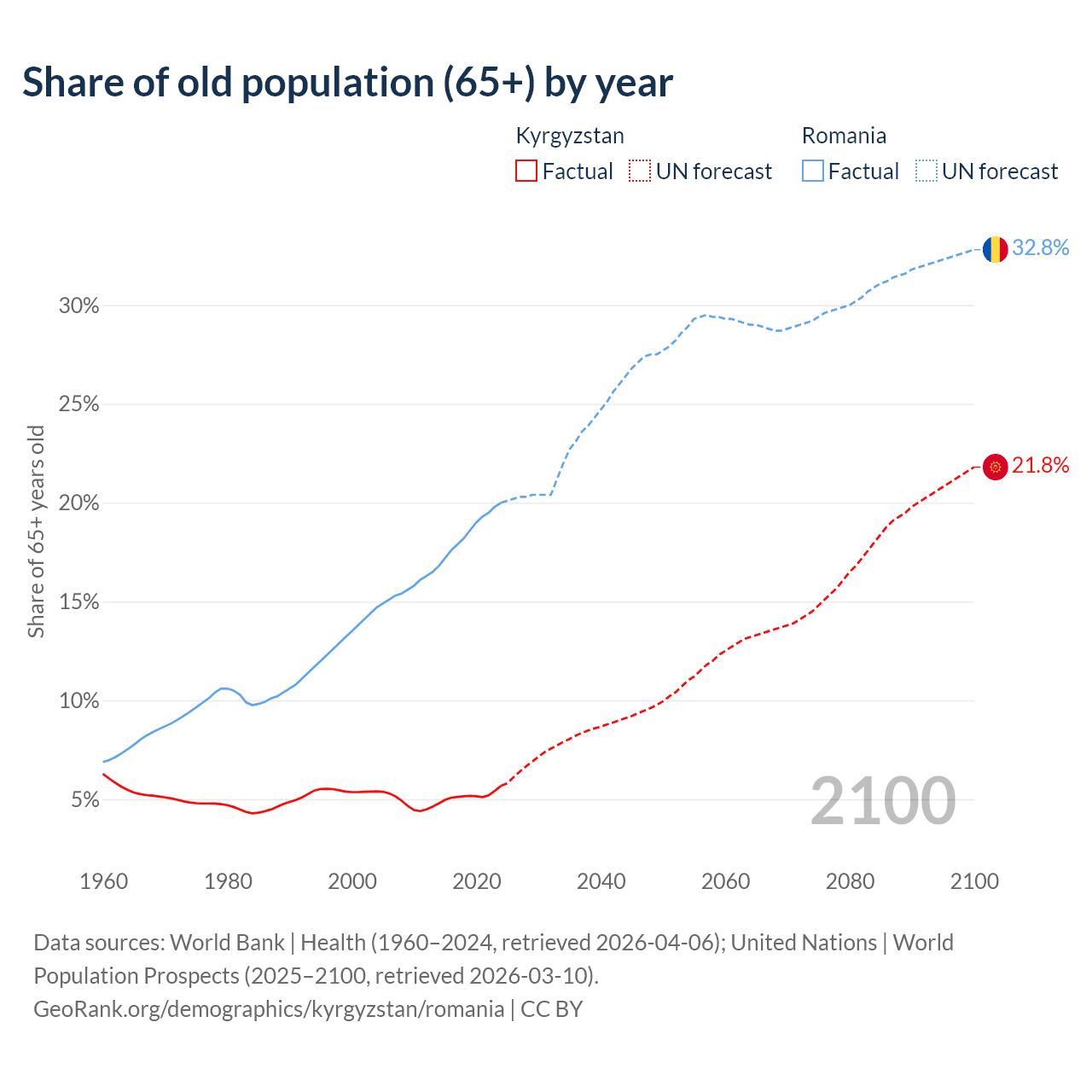 The share of older people aged 65 and over is 5.68% in Kyrgyzstan and 20% in Romania. Life expectancy in Kyrgyzstan compared to Romania .