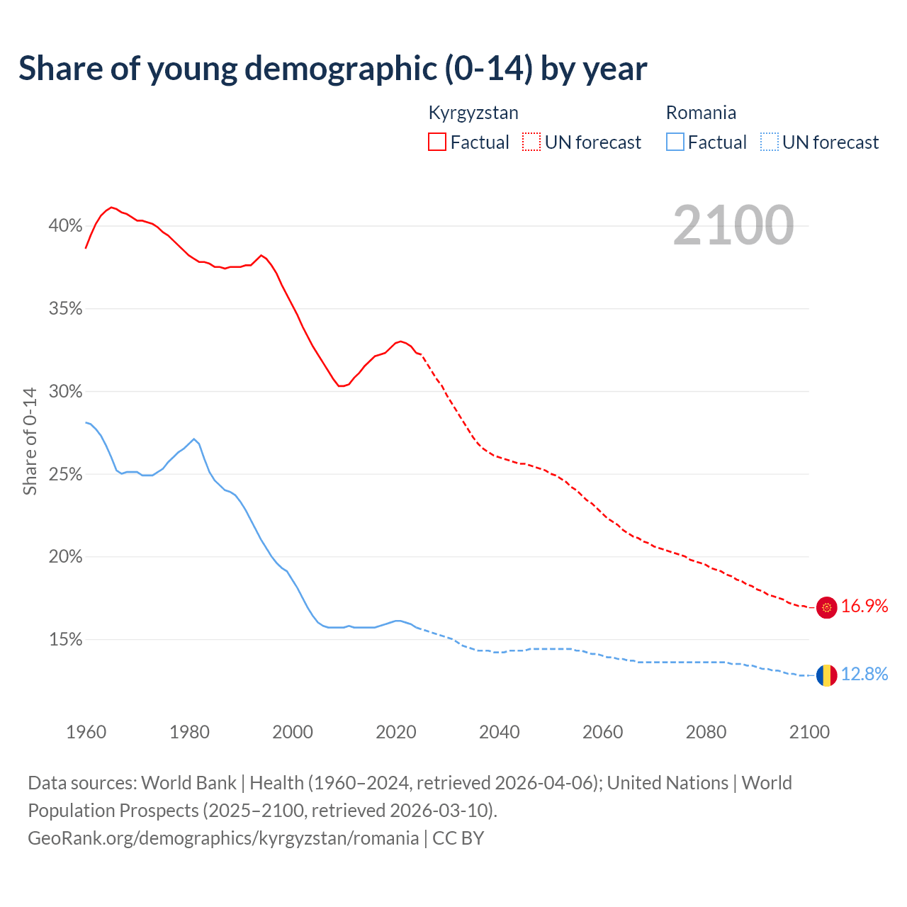 - The share of young demographic (0-15 years old) in Kyrgyzstan is 32.3% vs 15.7% in Romania.
