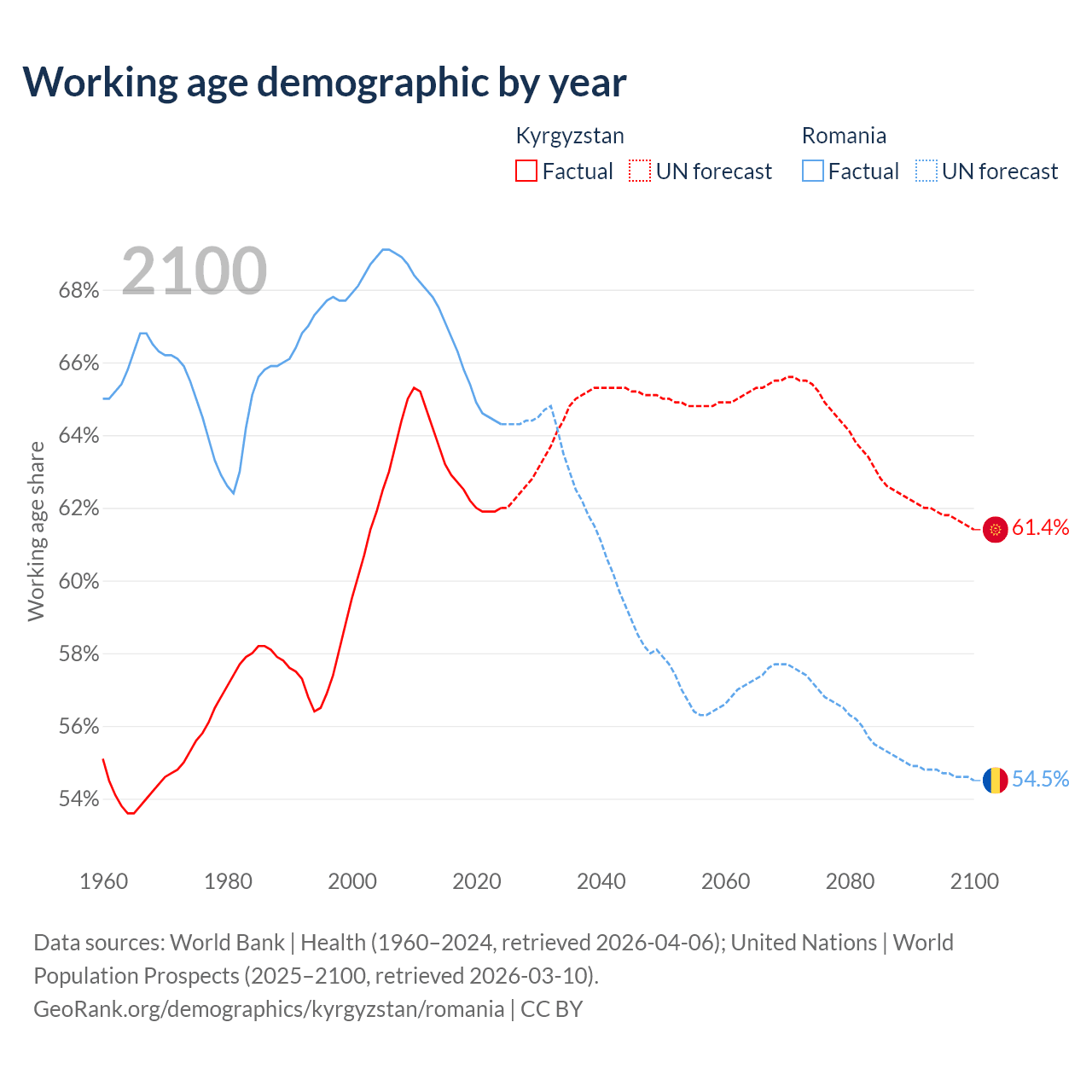 - Kyrgyzstan has 4.63M working age adults (aged 15-64) vs 12.1M in Romania.