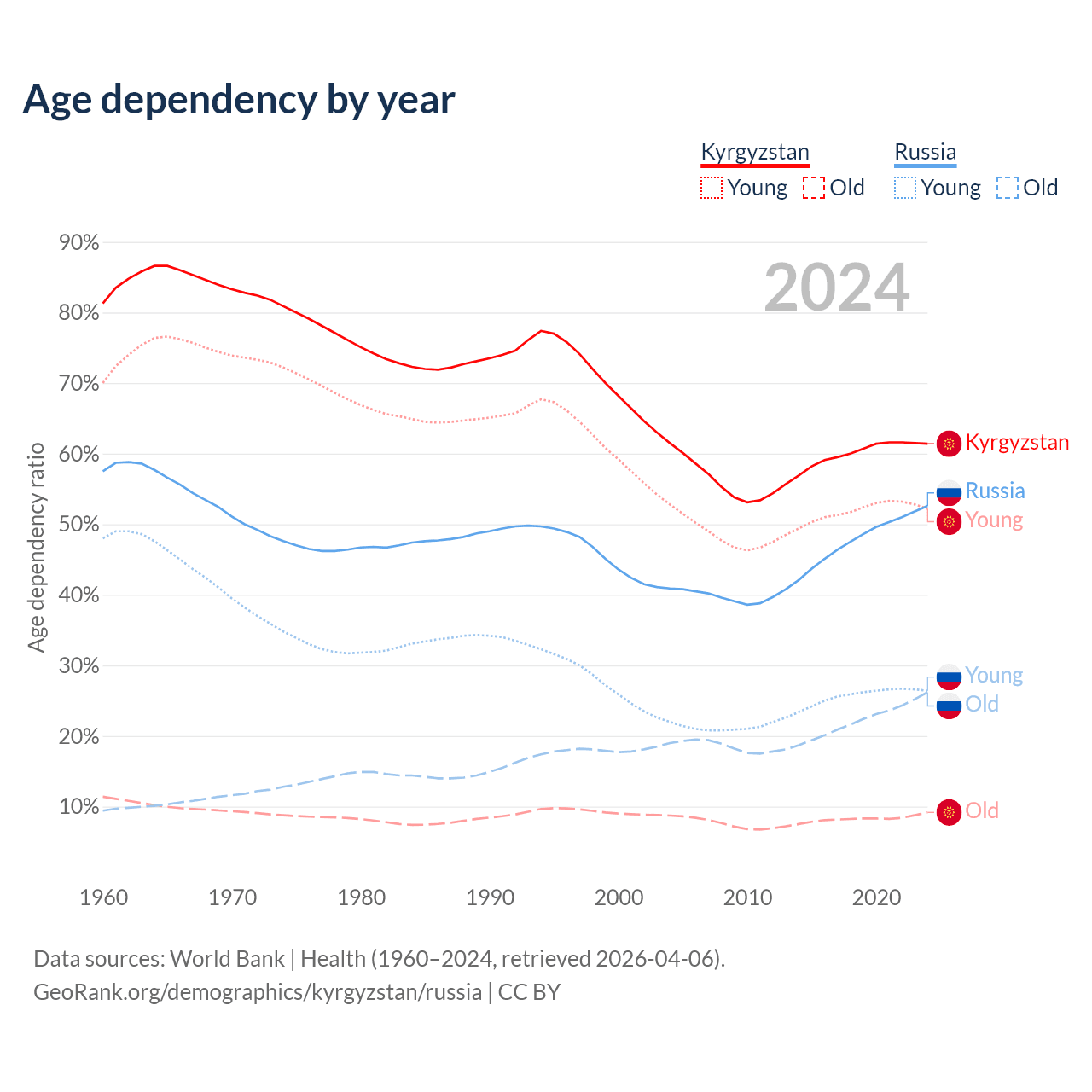 - Kyrgyzstan is ranked 126/196 by median age (oldest to youngest) vs 42/196 for Russia.