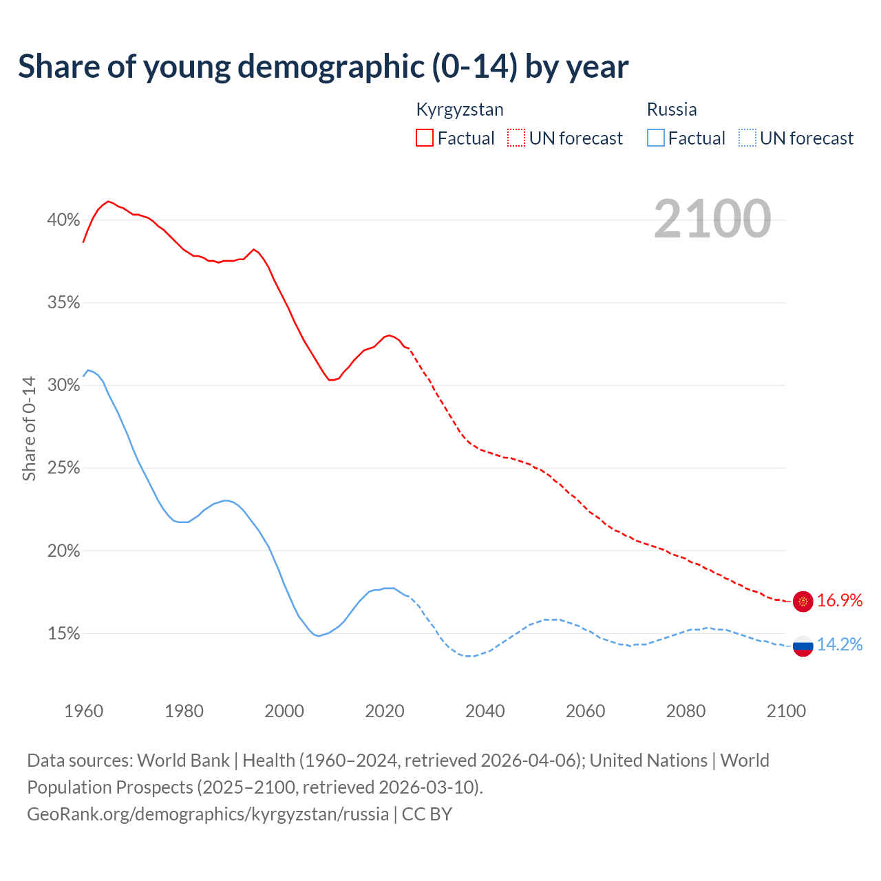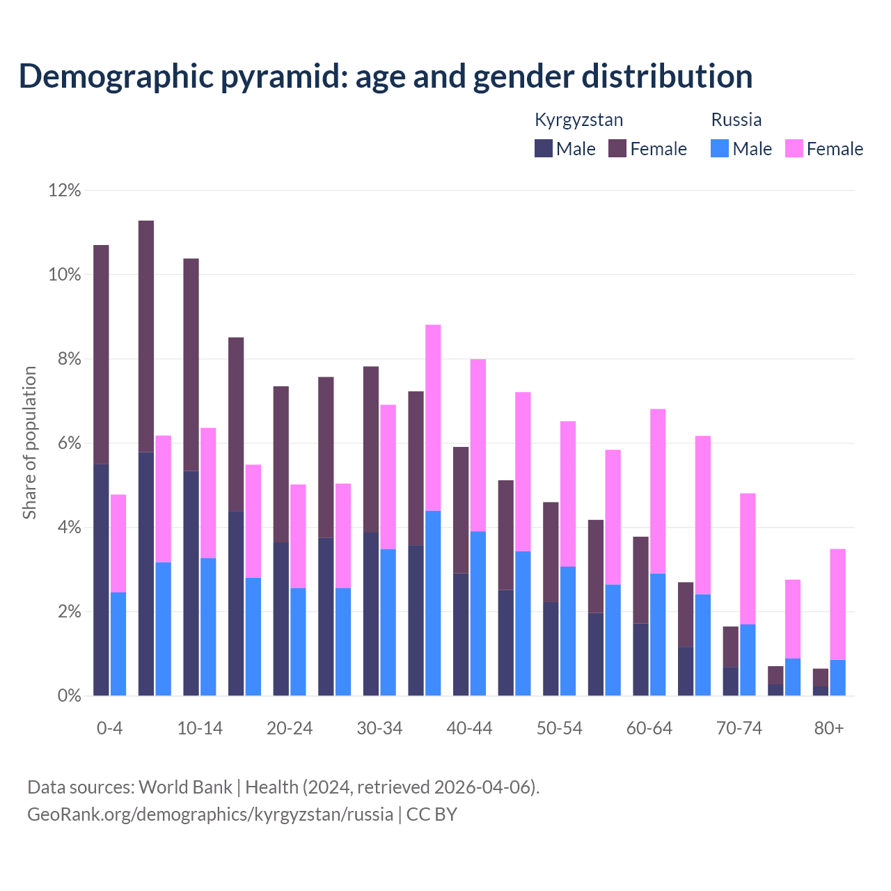 - As of 2026, the population of Kyrgyzstan is 7.47M vs 142M in Russia - 19 times difference.