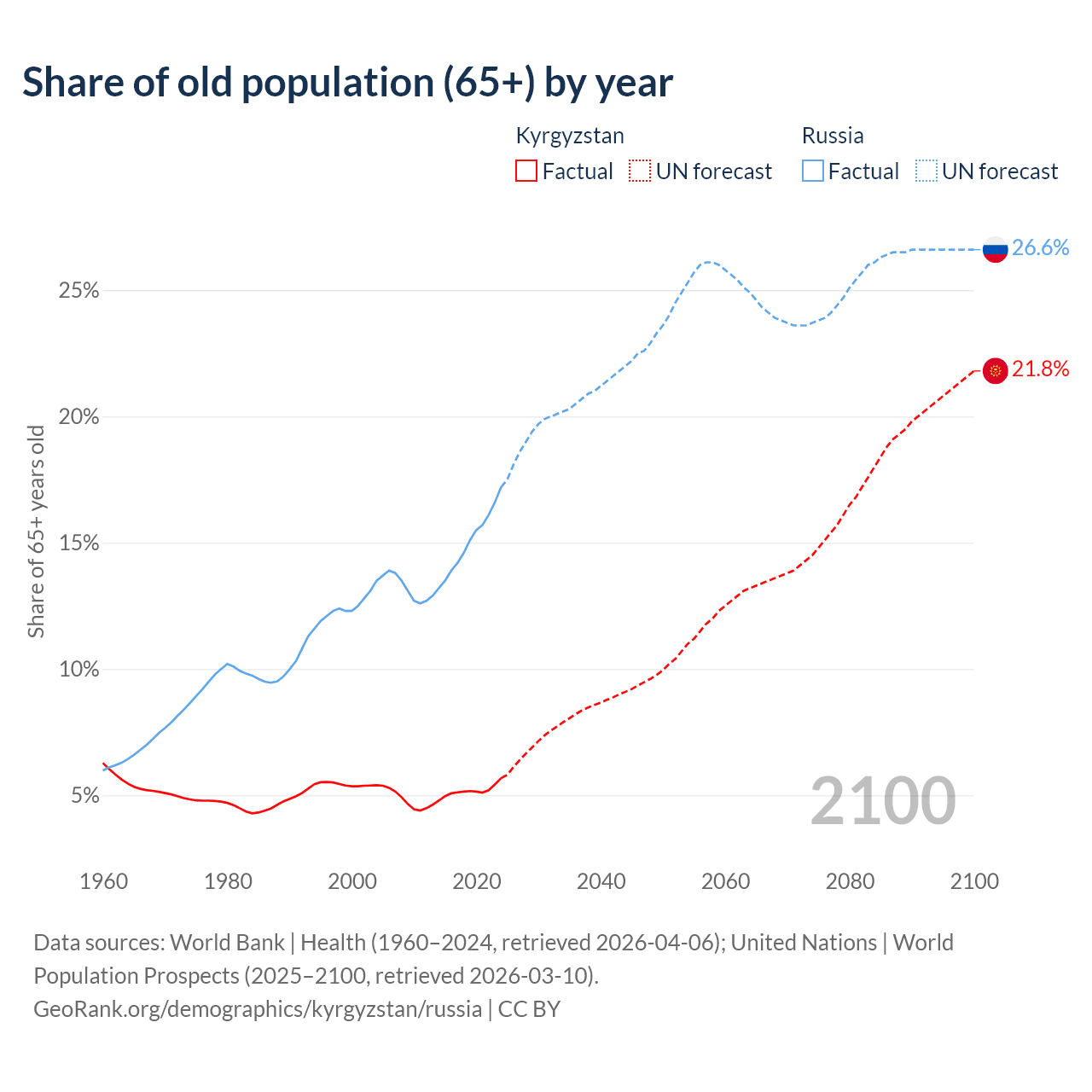 The share of older people aged 65 and over is 5.68% in Kyrgyzstan and 17.2% in Russia. Life expectancy in Kyrgyzstan compared to Russia .