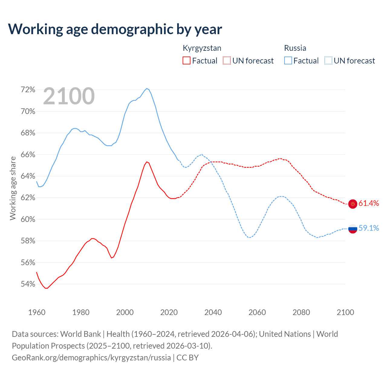 - Kyrgyzstan has 4.63M working age adults (aged 15-64) vs 93M in Russia.