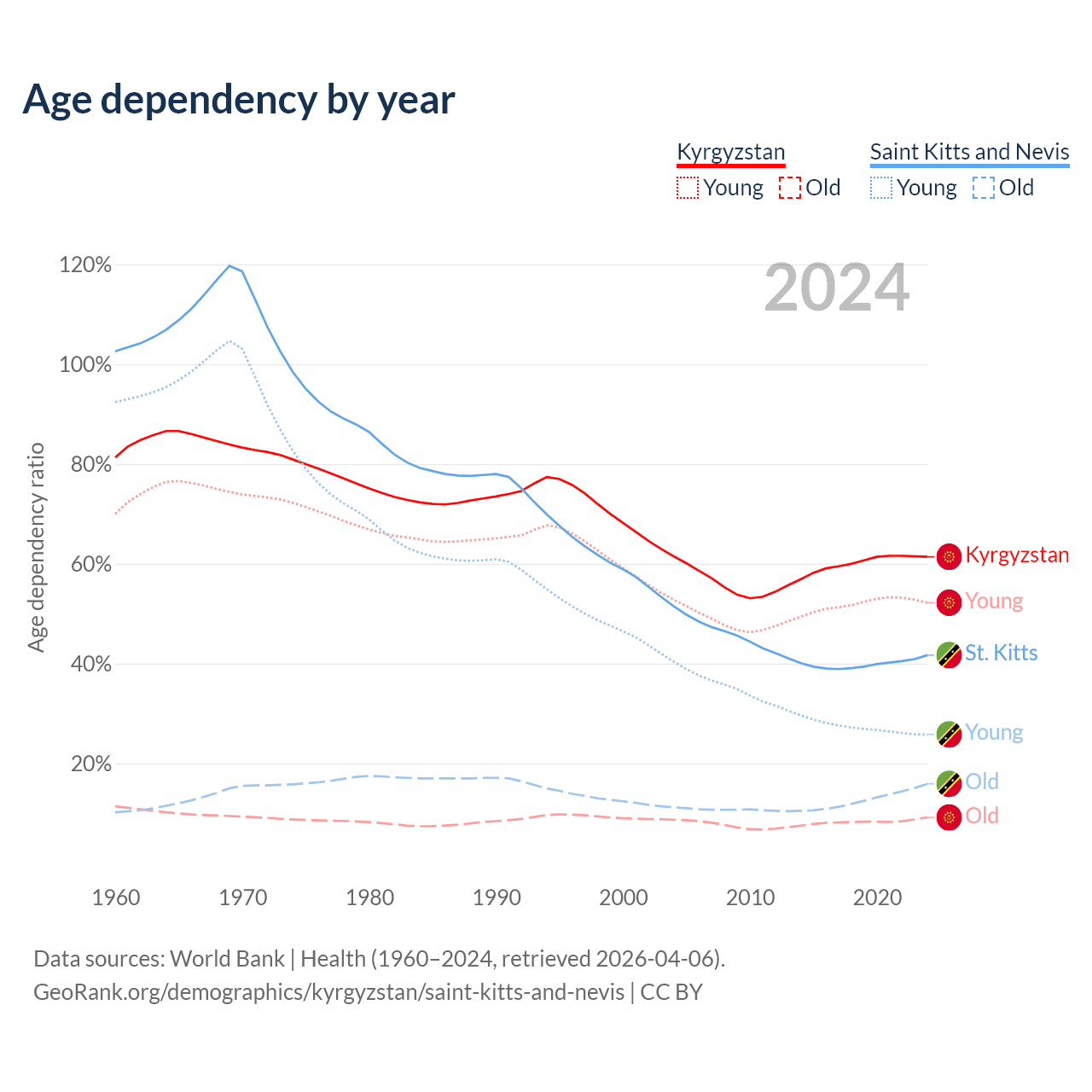 - The share of old-age demographic (65+) in Kyrgyzstan is 5.68% vs 11.2% in Saint Kitts and Nevis.