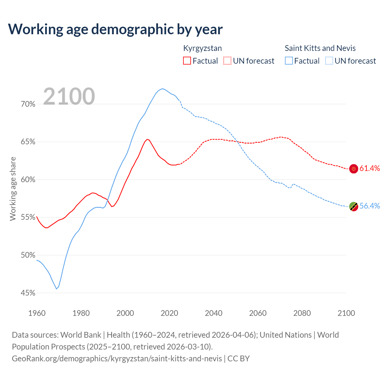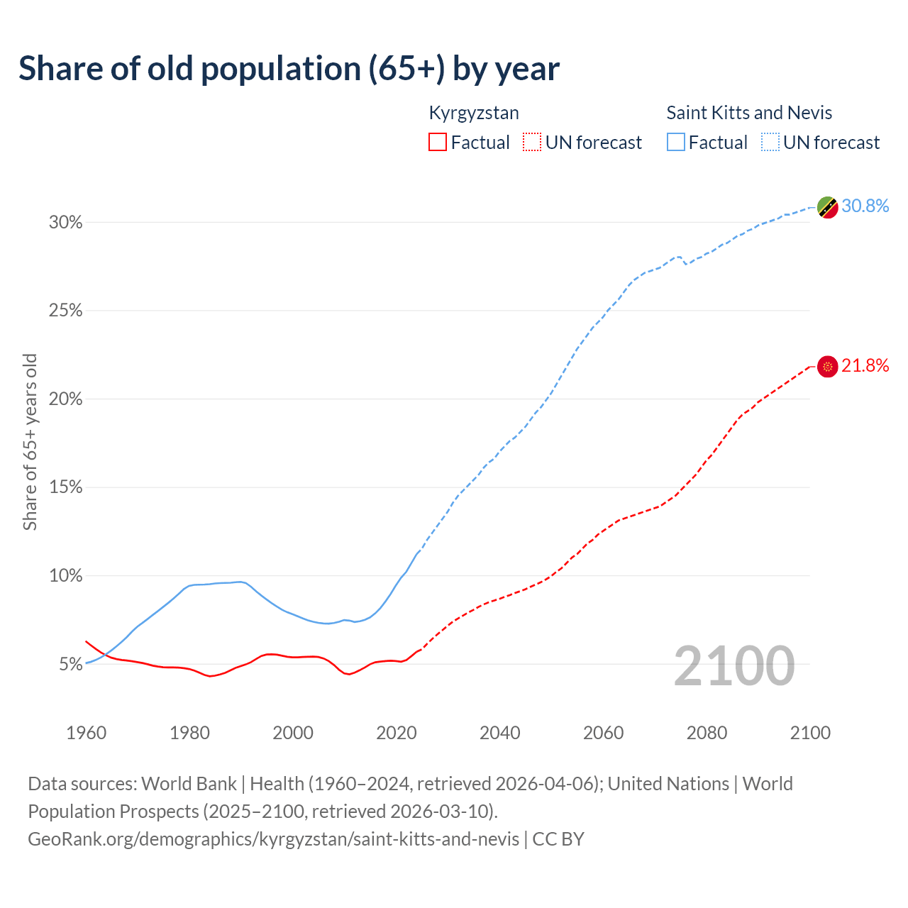 The share of older people aged 65 and over is 5.68% in Kyrgyzstan and 11.2% in Saint Kitts and Nevis. Life expectancy in Kyrgyzstan compared to Saint Kitts and Nevis .