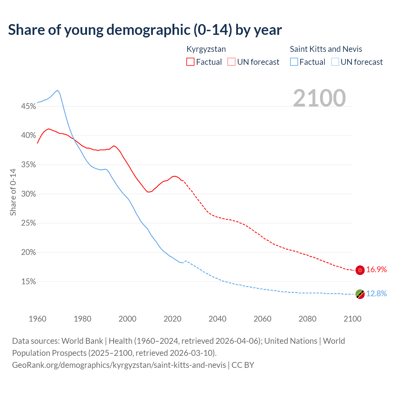 - The share of young demographic (0-15 years old) in Kyrgyzstan is 32.3% vs 18.2% in Saint Kitts and Nevis.