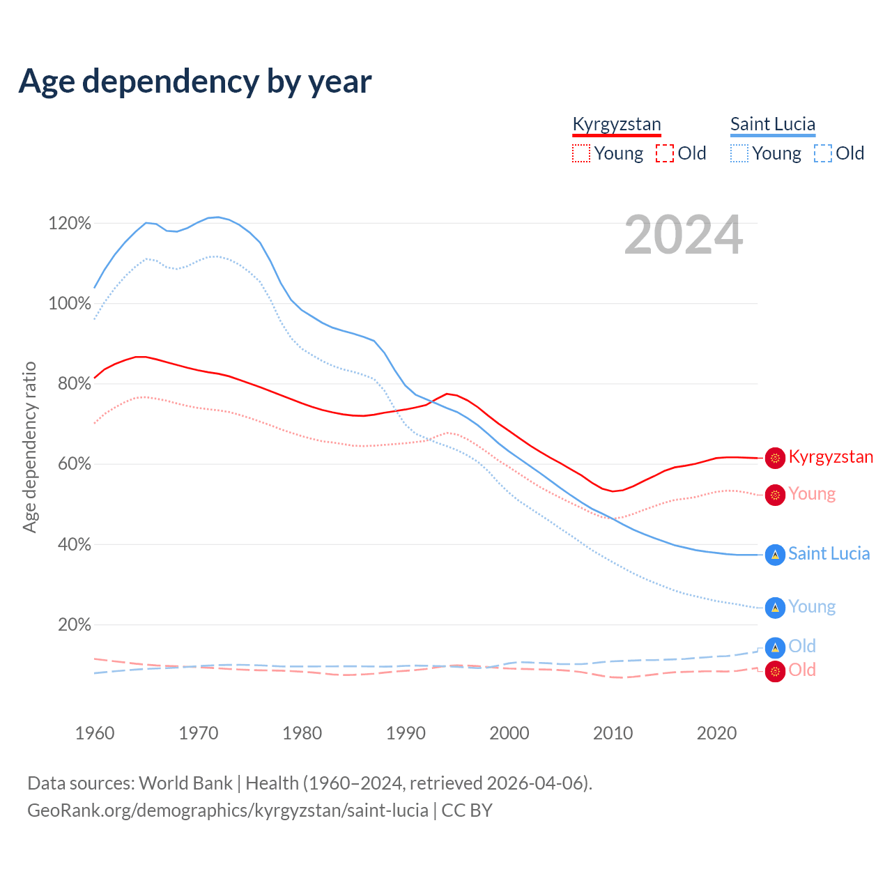 - The share of old-age demographic (65+) in Kyrgyzstan is 5.68% vs 9.62% in Saint Lucia.