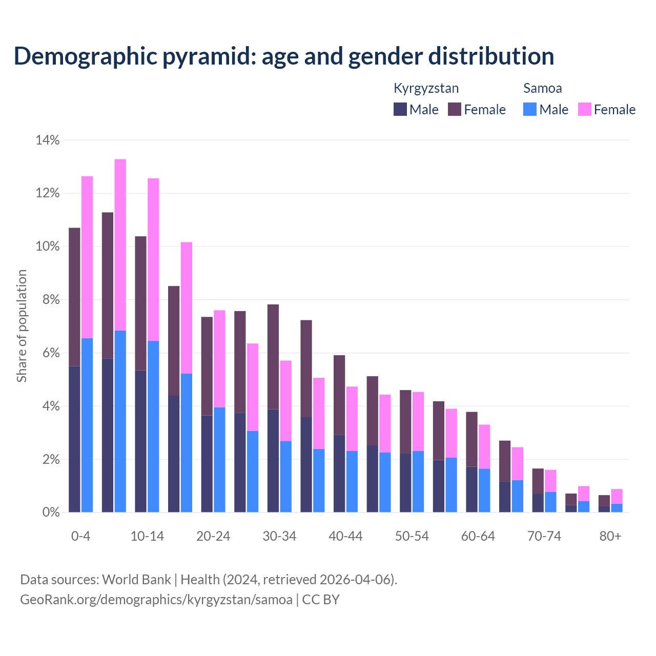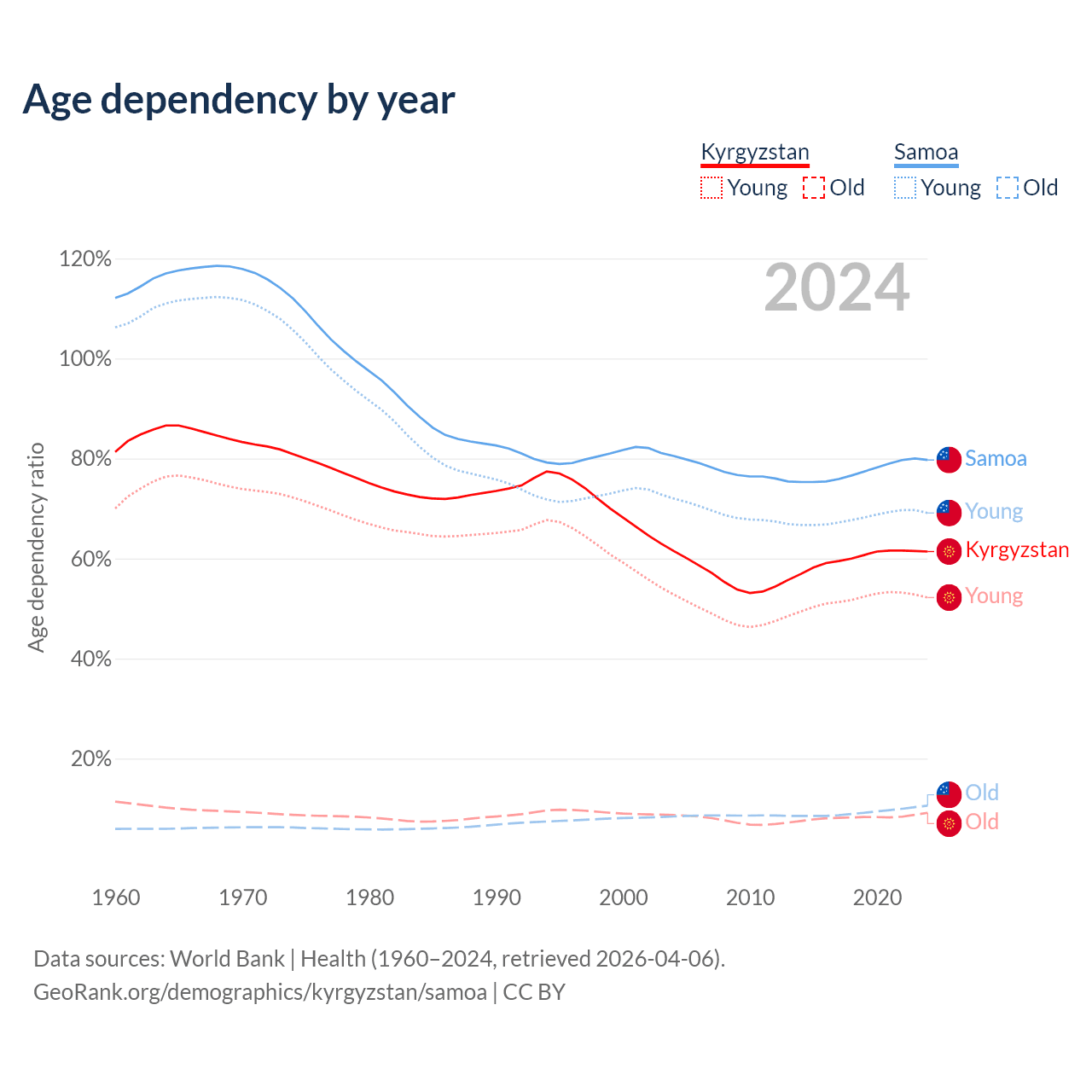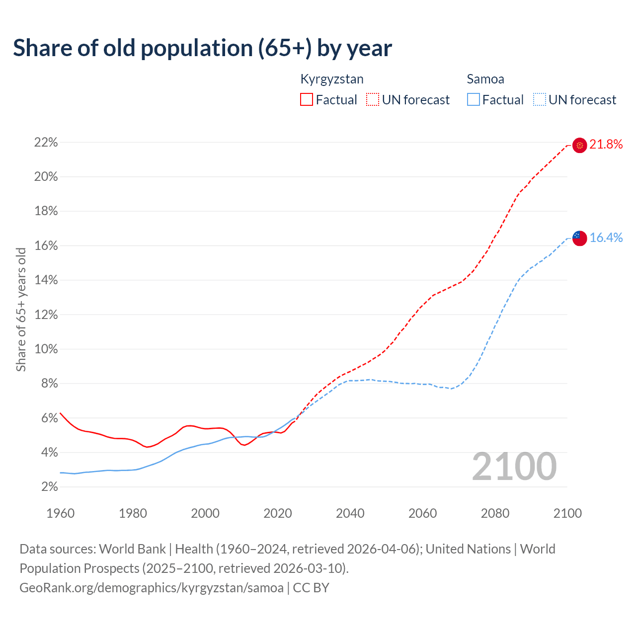 - The share of old-age demographic (65+) in Kyrgyzstan is 5.68% vs 5.88% in Samoa.