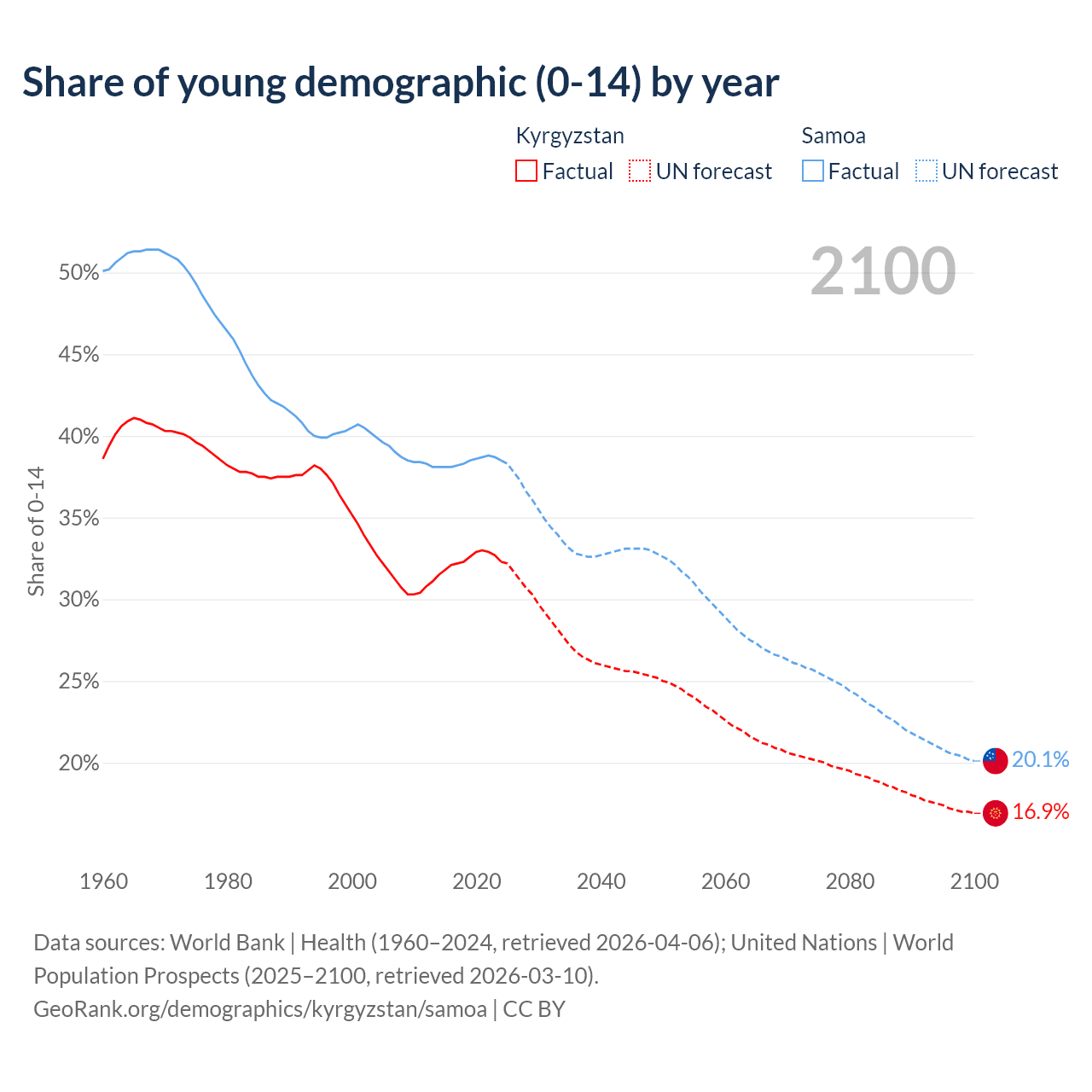 - The share of young demographic (0-15 years old) in Kyrgyzstan is 32.3% vs 38.5% in Samoa.
