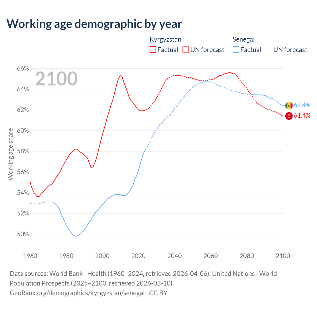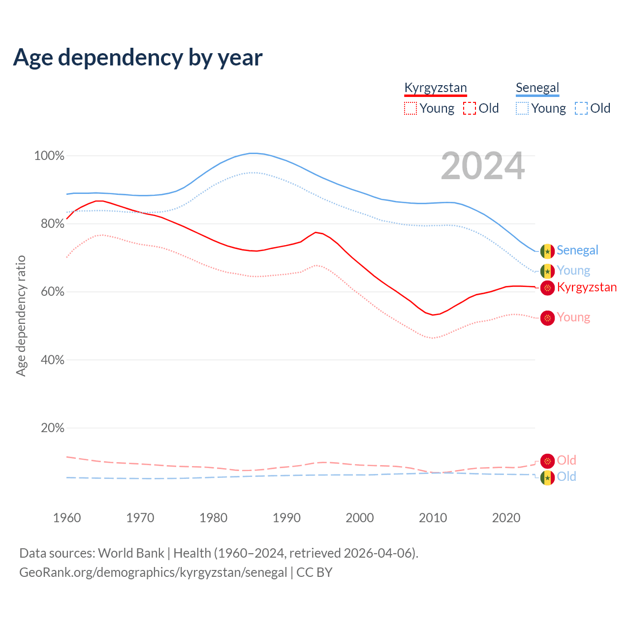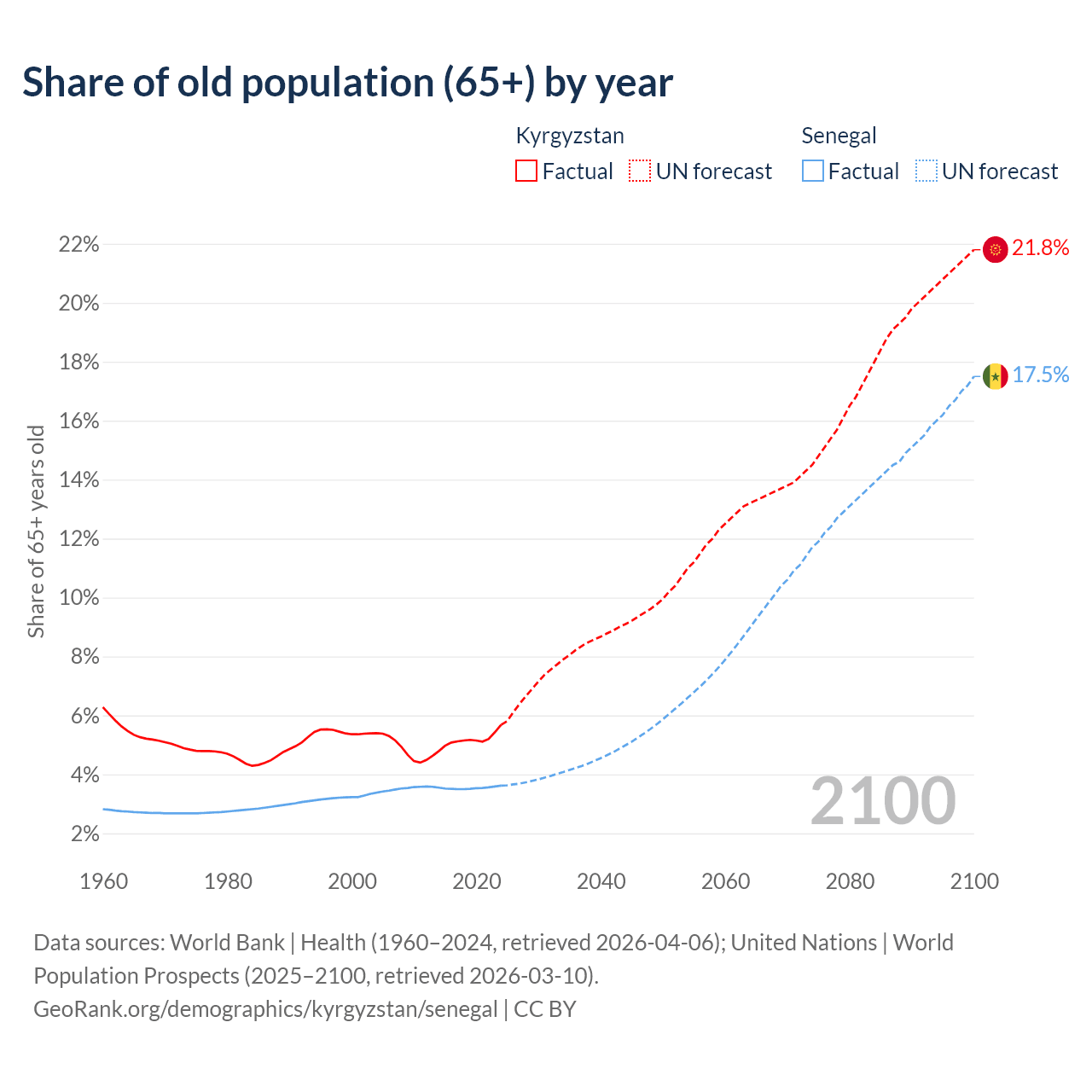 - The share of old-age demographic (65+) in Kyrgyzstan is 5.68% vs 3.62% in Senegal.