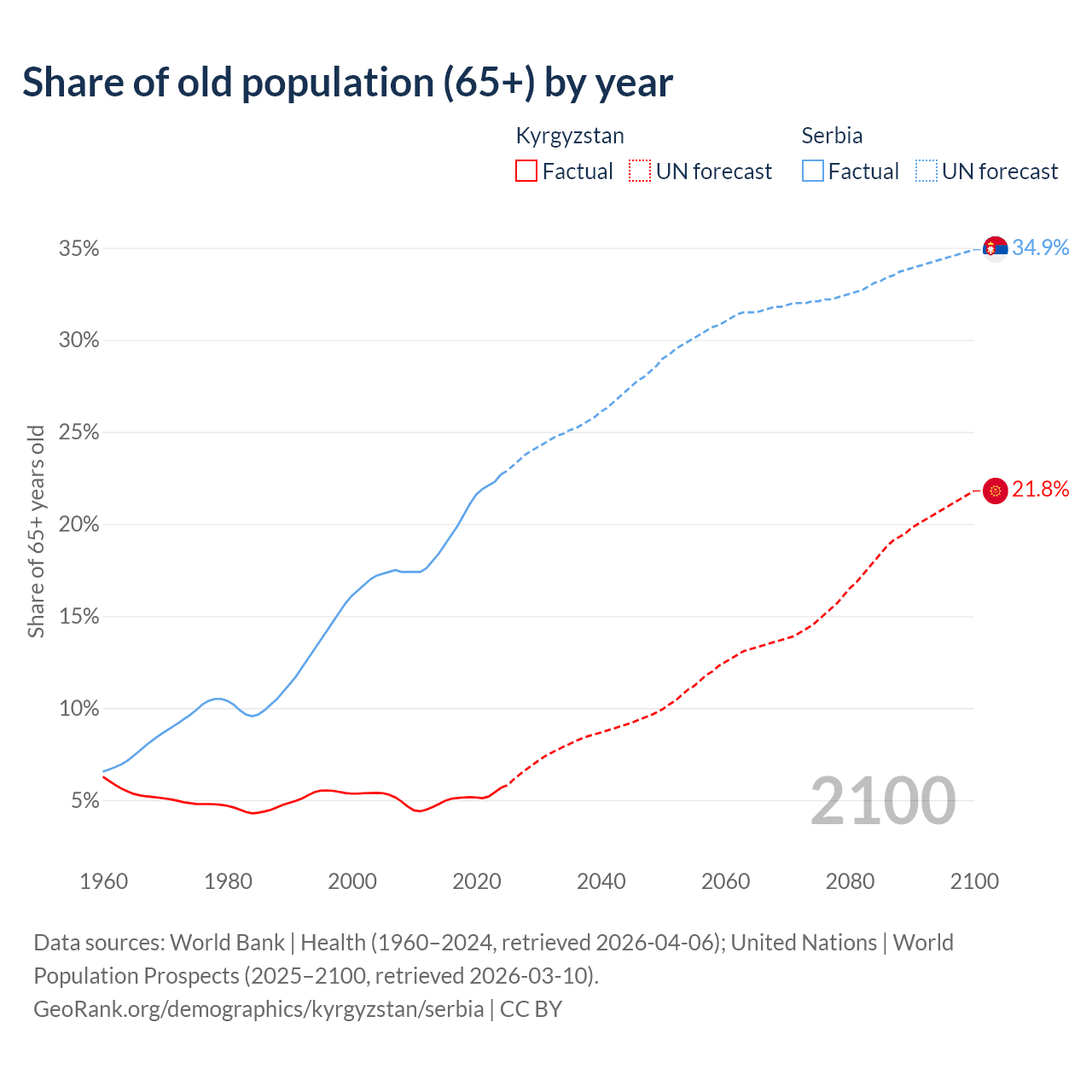 The share of older people aged 65 and over is 5.68% in Kyrgyzstan and 22.7% in Serbia. Life expectancy in Kyrgyzstan compared to Serbia .