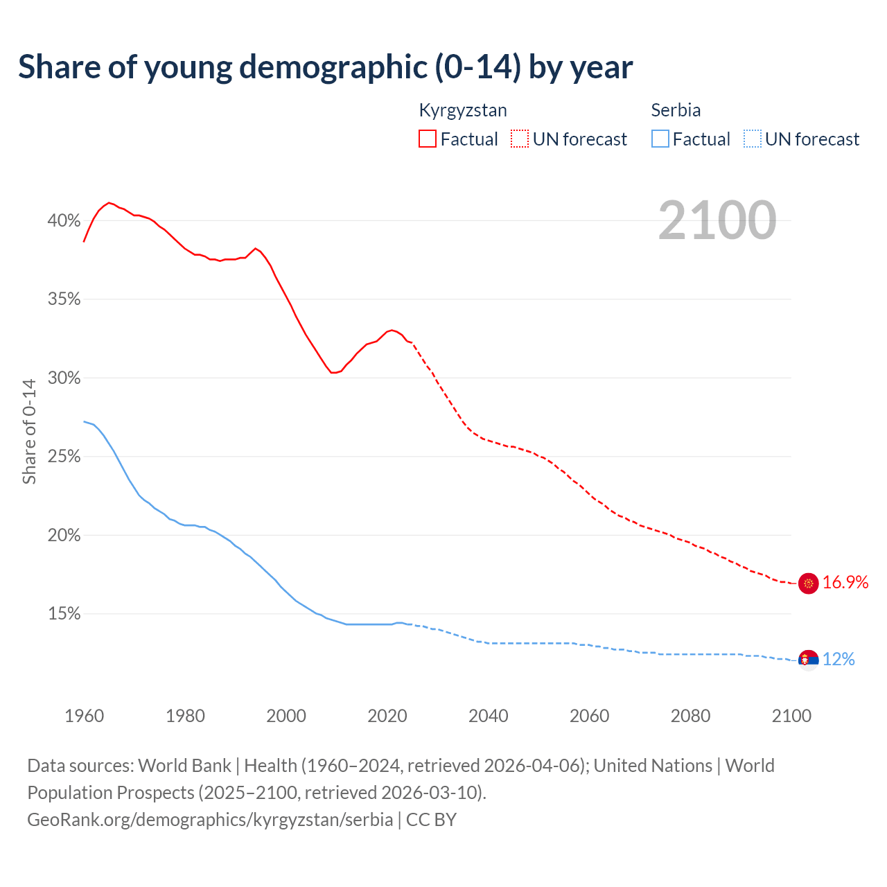 - The share of young demographic (0-15 years old) in Kyrgyzstan is 32.3% vs 14.3% in Serbia.