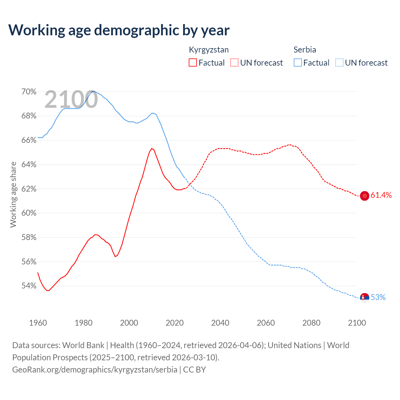 Median age Kyrgyzstan vs Serbia, 1960-2100