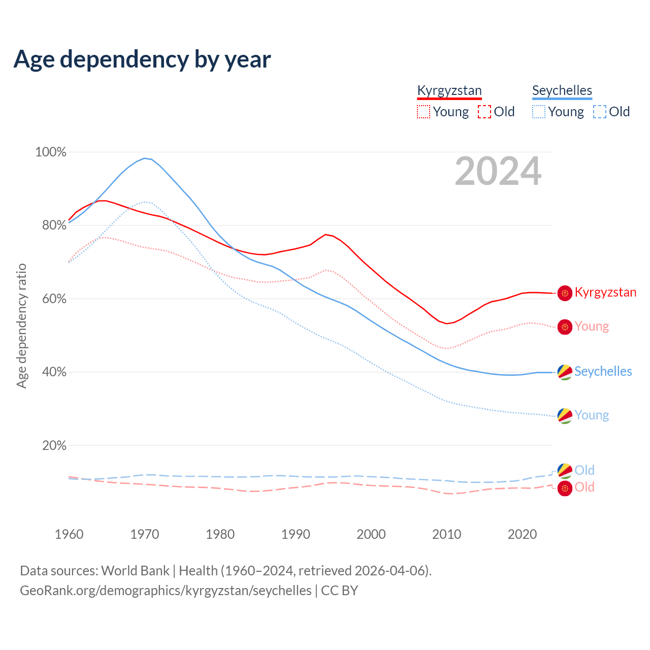- Kyrgyzstan is ranked 126/196 by median age (oldest to youngest) vs 76/196 for the Seychelles.