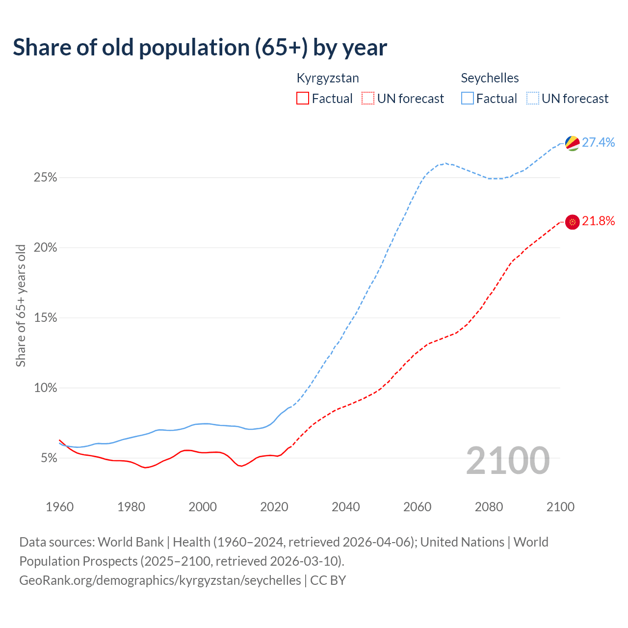The share of older people aged 65 and over is 5.68% in Kyrgyzstan and 8.54% in the Seychelles. Life expectancy in Kyrgyzstan compared to the Seychelles .