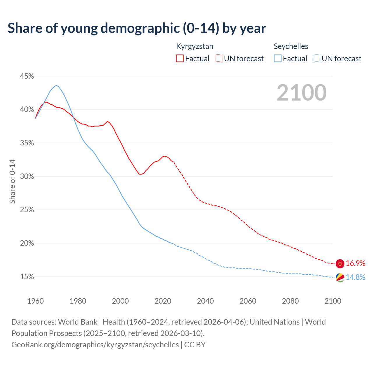 - The share of young demographic (0-15 years old) in Kyrgyzstan is 32.3% vs 20% in the Seychelles.