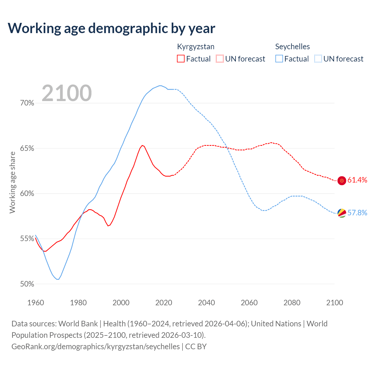- Kyrgyzstan has 4.63M working age adults (aged 15-64) vs 90.3K in the Seychelles.