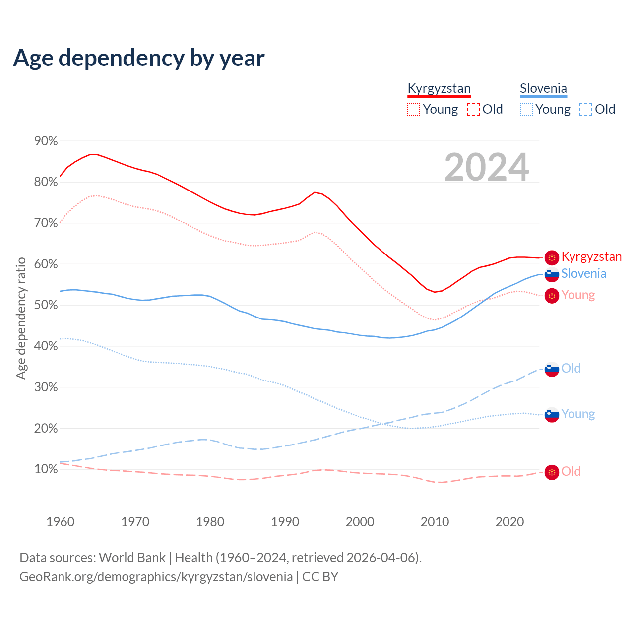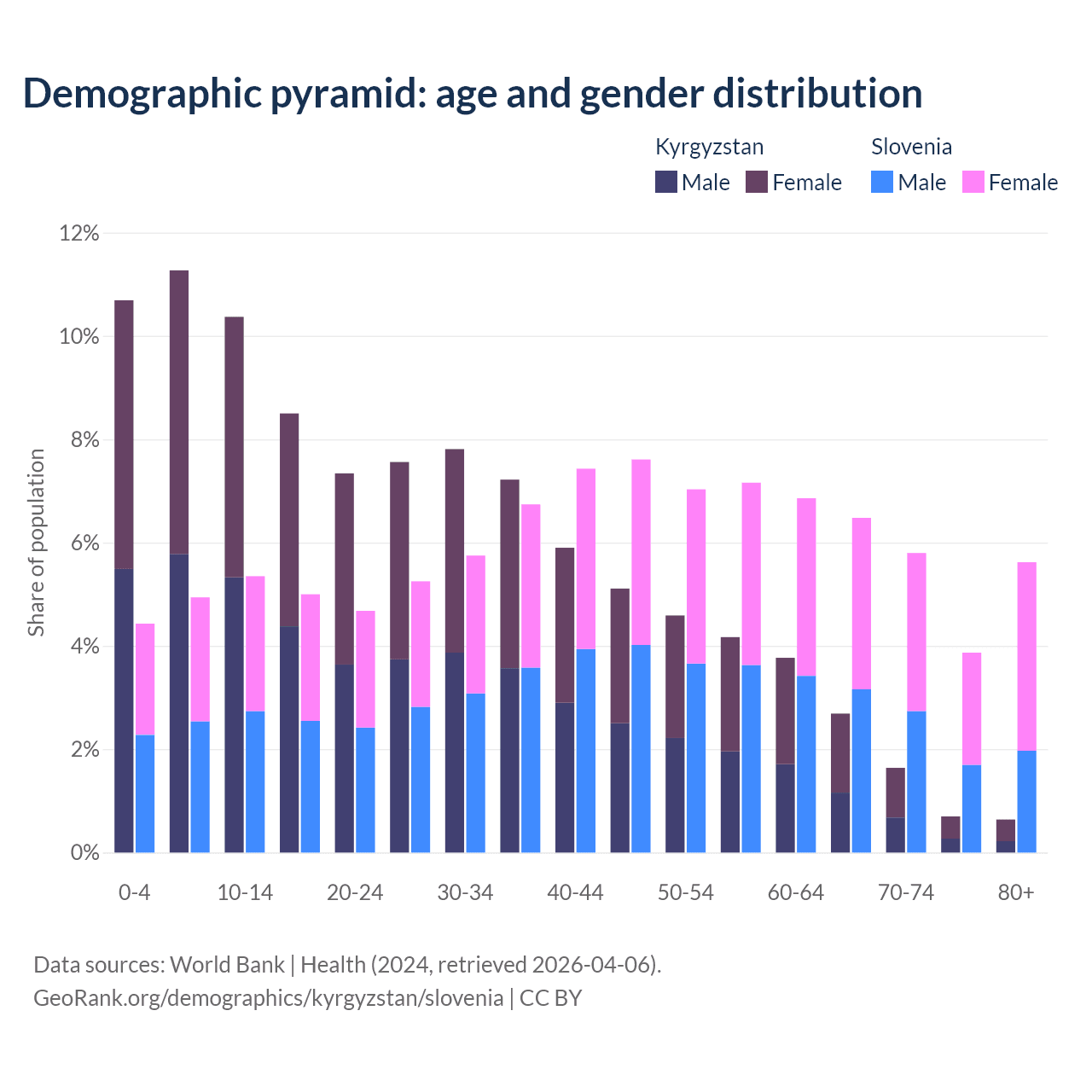 - The share of old-age demographic (65+) in Kyrgyzstan is 5.68% vs 21.8% in Slovenia.