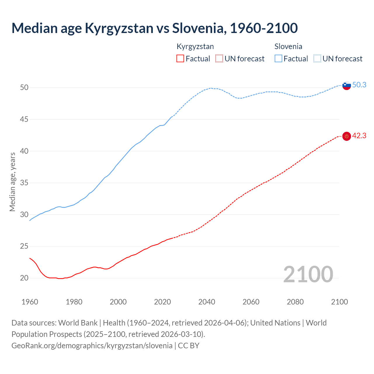 - The median age in Kyrgyzstan is 26.2 years compared to 45.3 years in Slovenia.