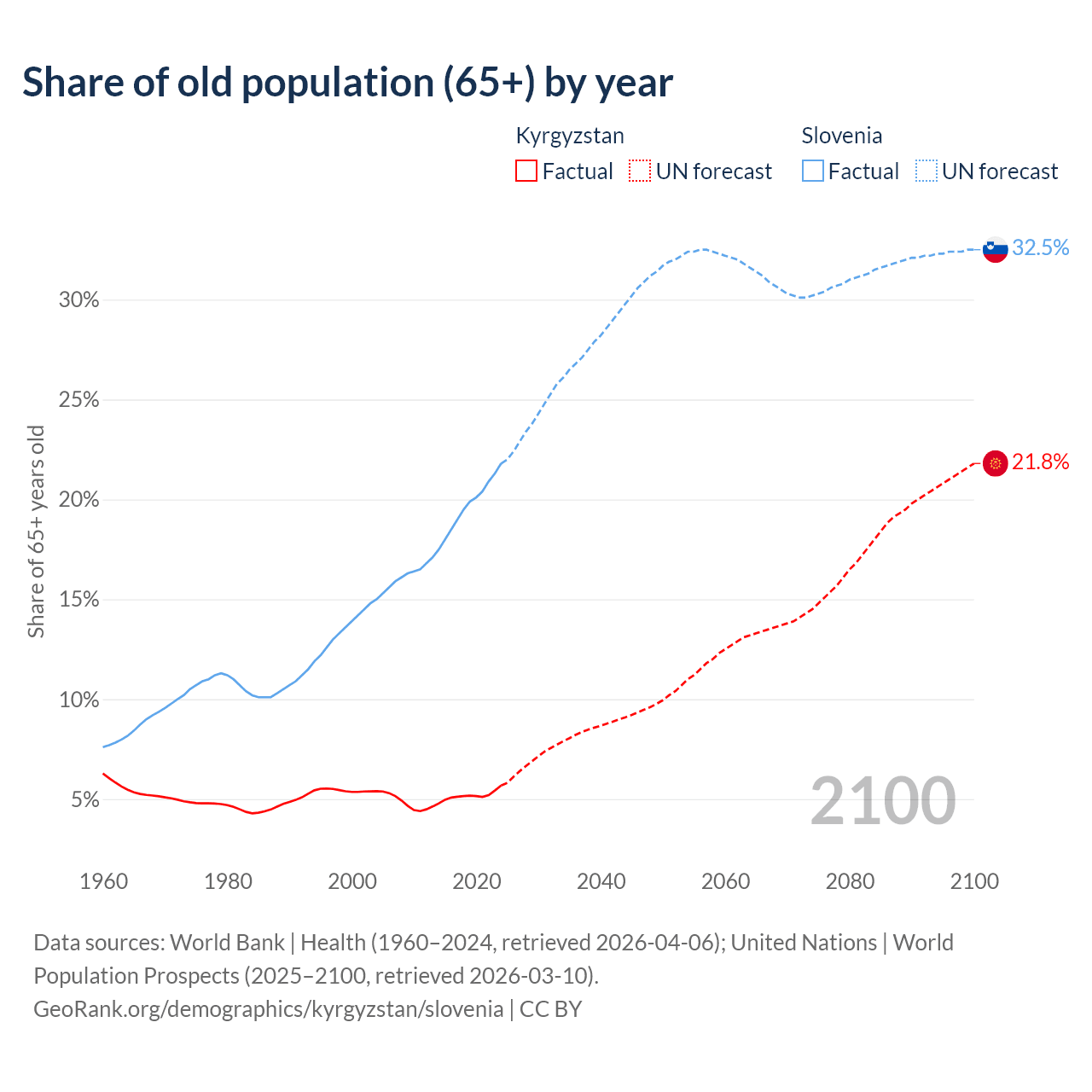 The share of older people aged 65 and over is 5.68% in Kyrgyzstan and 21.8% in Slovenia. Life expectancy in Kyrgyzstan compared to Slovenia .