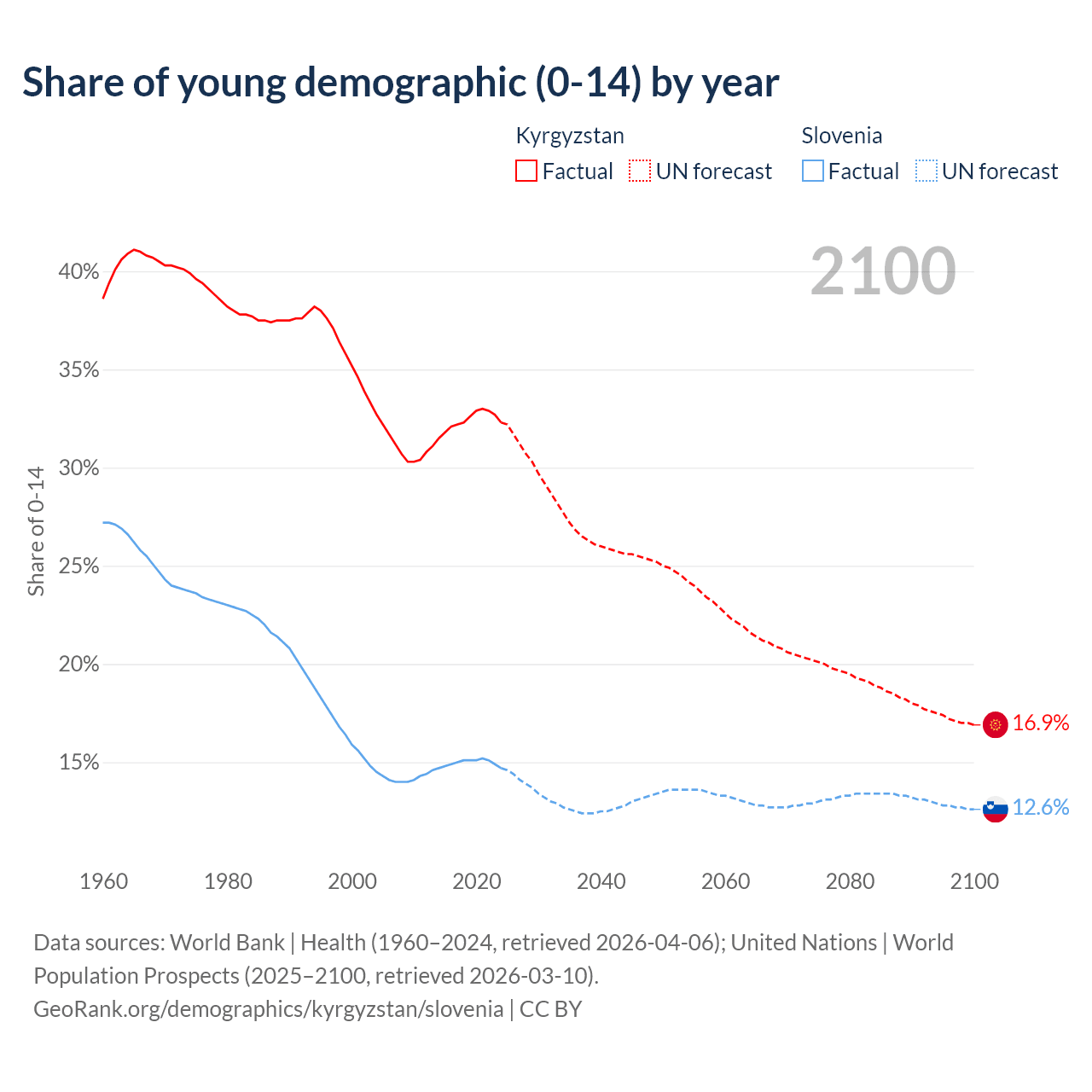 - The share of young demographic (0-15 years old) in Kyrgyzstan is 32.3% vs 14.7% in Slovenia.