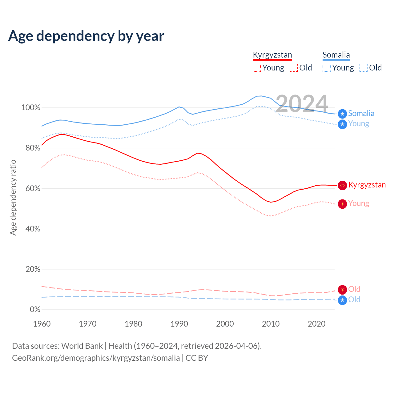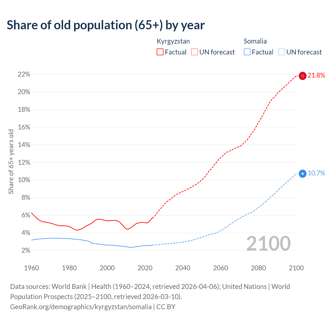 - The share of old-age demographic (65+) in Kyrgyzstan is 5.68% vs 2.59% in Somalia.