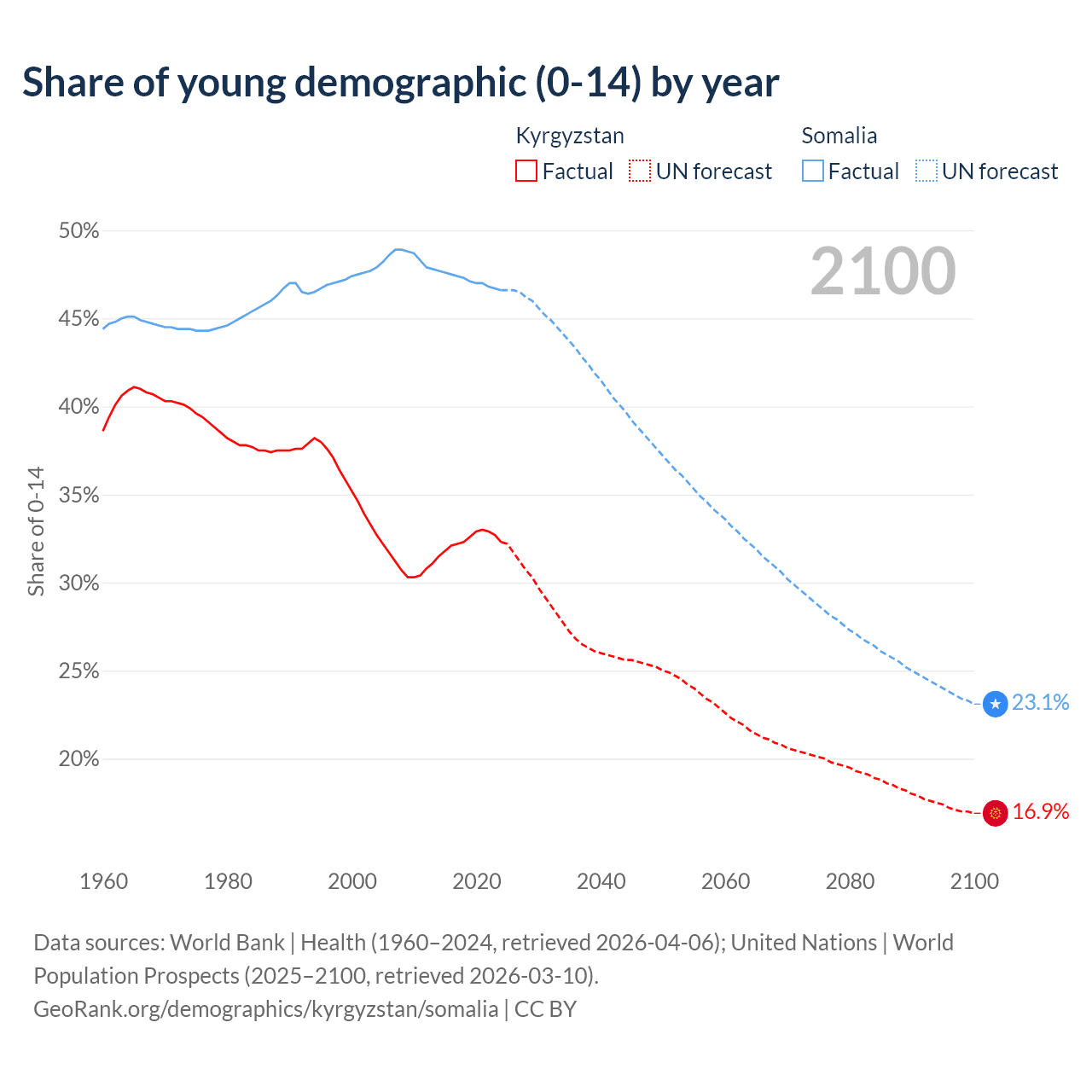 - The share of young demographic (0-15 years old) in Kyrgyzstan is 32.3% vs 46.6% in Somalia.