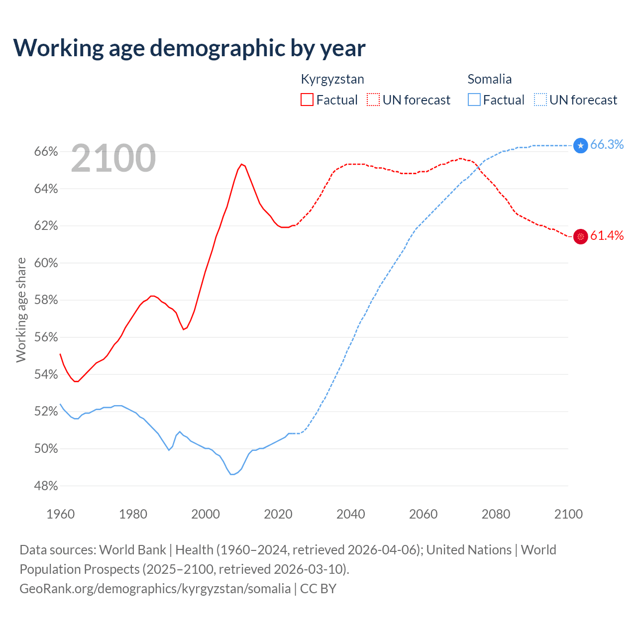 - Kyrgyzstan has 4.63M working age adults (aged 15-64) vs 10.4M in Somalia.