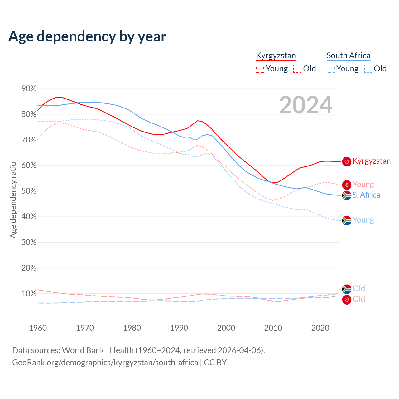 - The share of old-age demographic (65+) in Kyrgyzstan is 5.68% vs 6.69% in South Africa.