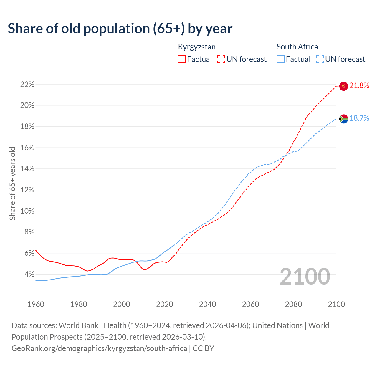 The share of older people aged 65 and over is 5.68% in Kyrgyzstan and 6.69% in South Africa. Life expectancy in Kyrgyzstan compared to South Africa .