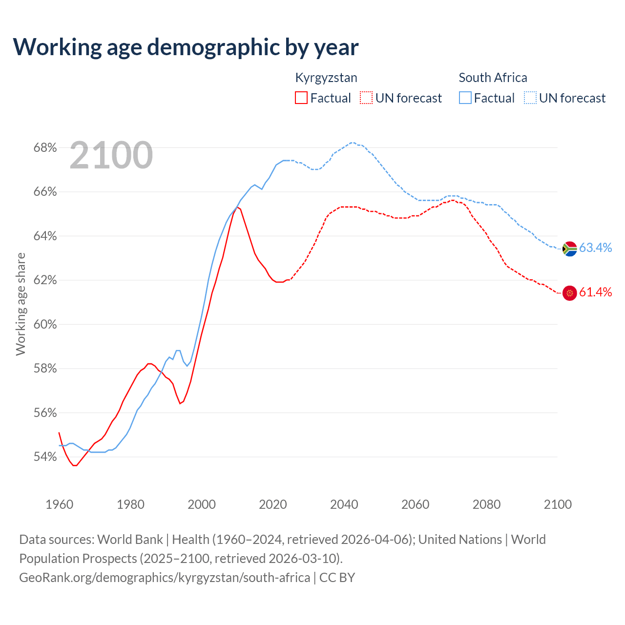 Median age Kyrgyzstan vs South Africa, 1960-2100