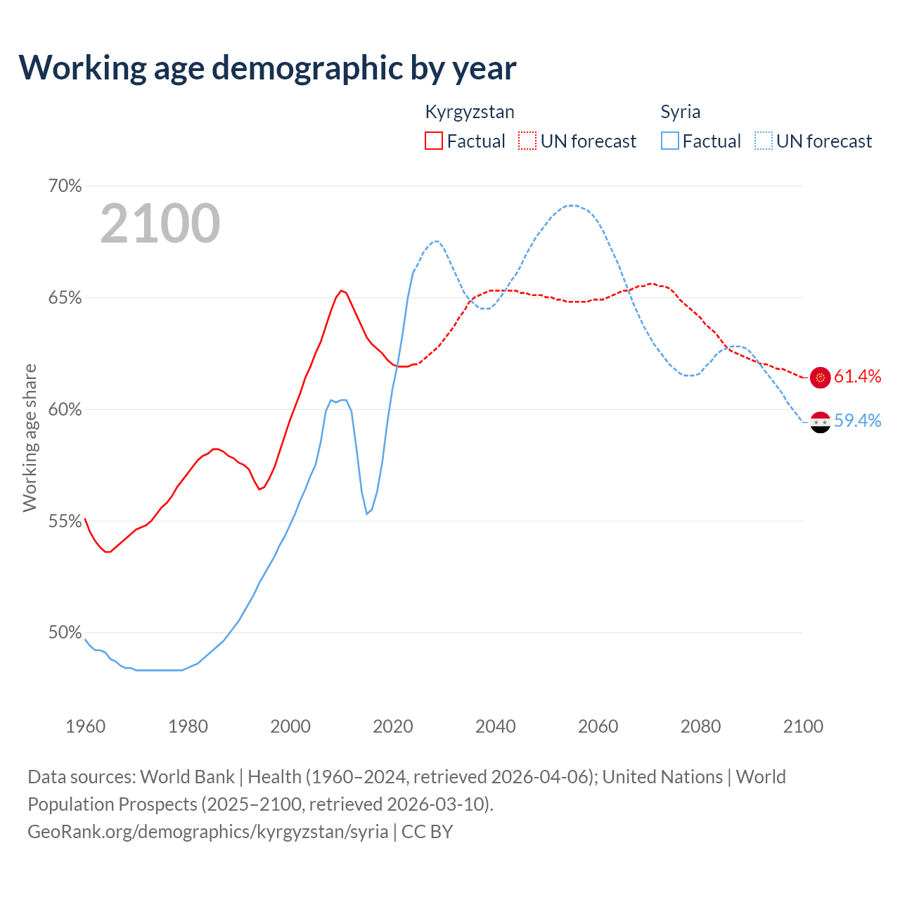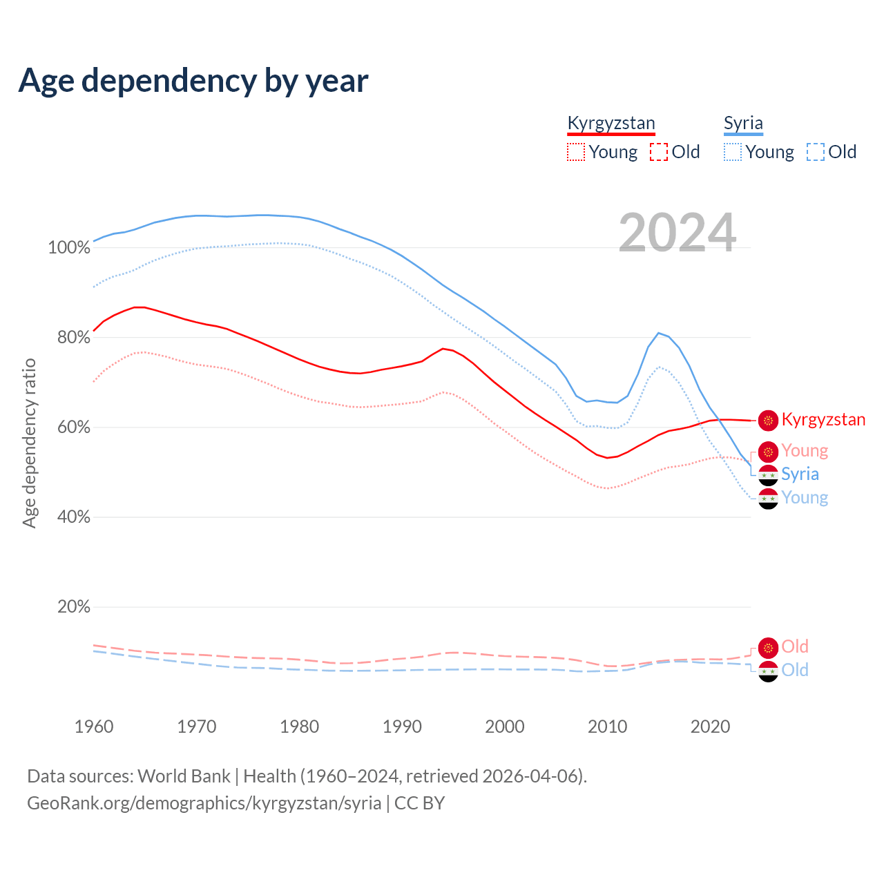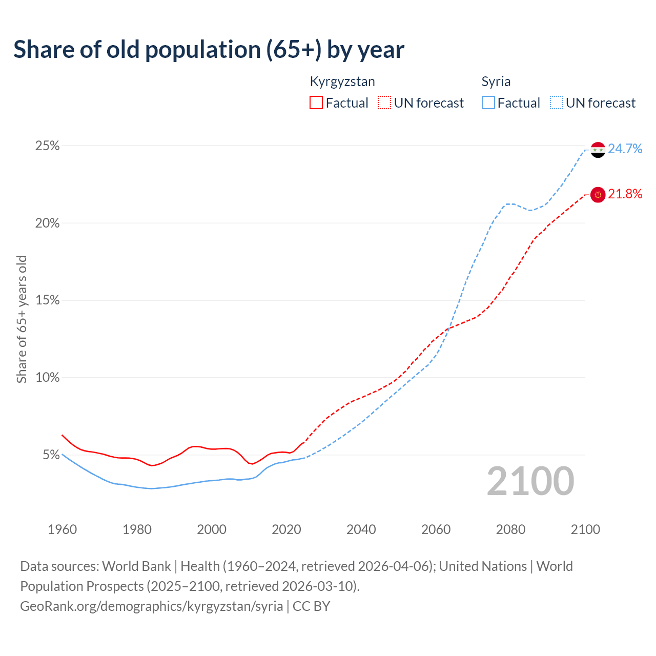 - The share of old-age demographic (65+) in Kyrgyzstan is 5.68% vs 4.74% in Syria.