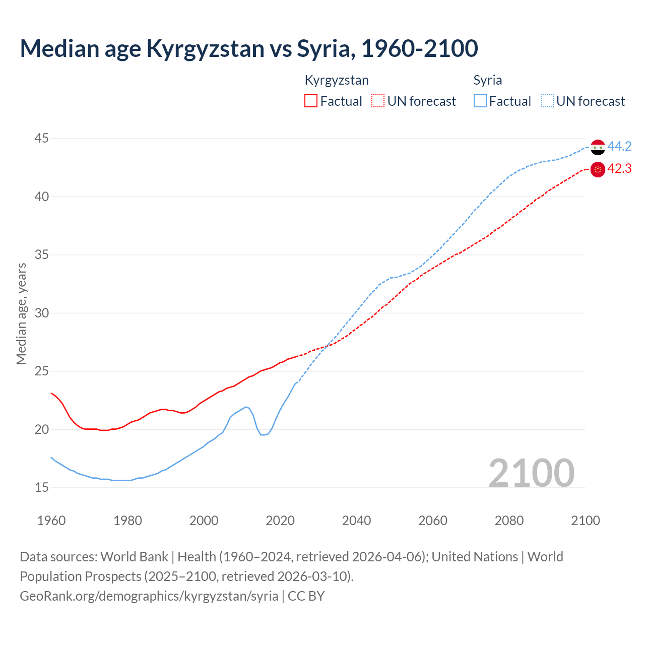 Median age Kyrgyzstan vs Syria, 1960-2100
