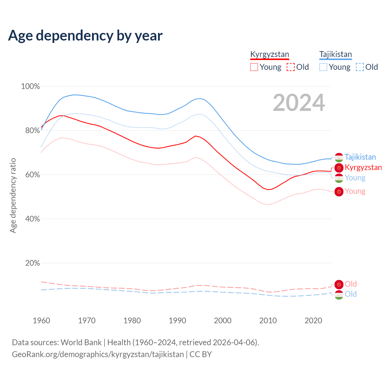 Data sources: World Bank | Health (1960–2024, retrieved 2026-04-06); U.S. Census Bureau (1960–2024, retrieved 2026-02-08).