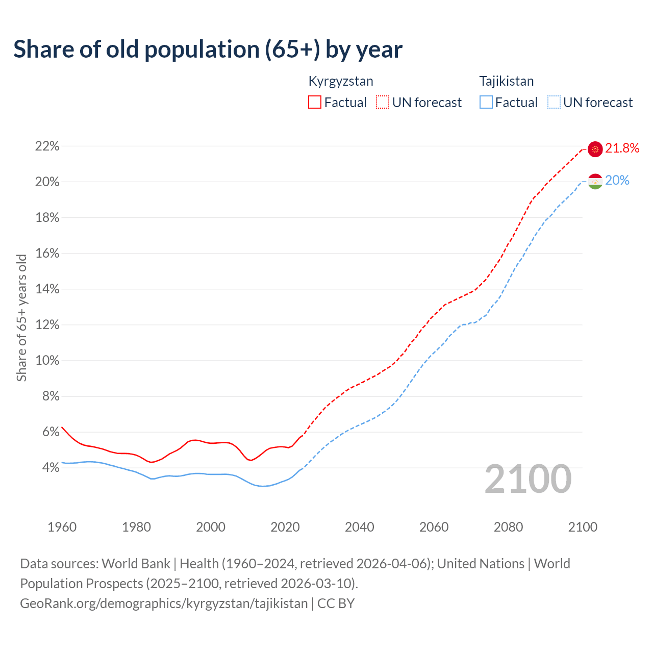 The share of older people aged 65 and over is 5.68% in Kyrgyzstan and 3.85% in Tajikistan. Life expectancy in Kyrgyzstan compared to Tajikistan .
